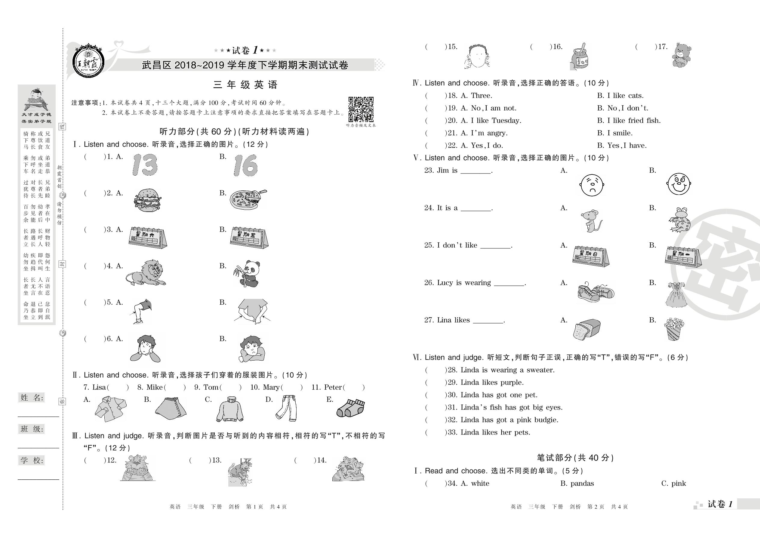 2018-2019学年第二学期武汉市武昌区三年级英语试卷(剑桥版)【1】
