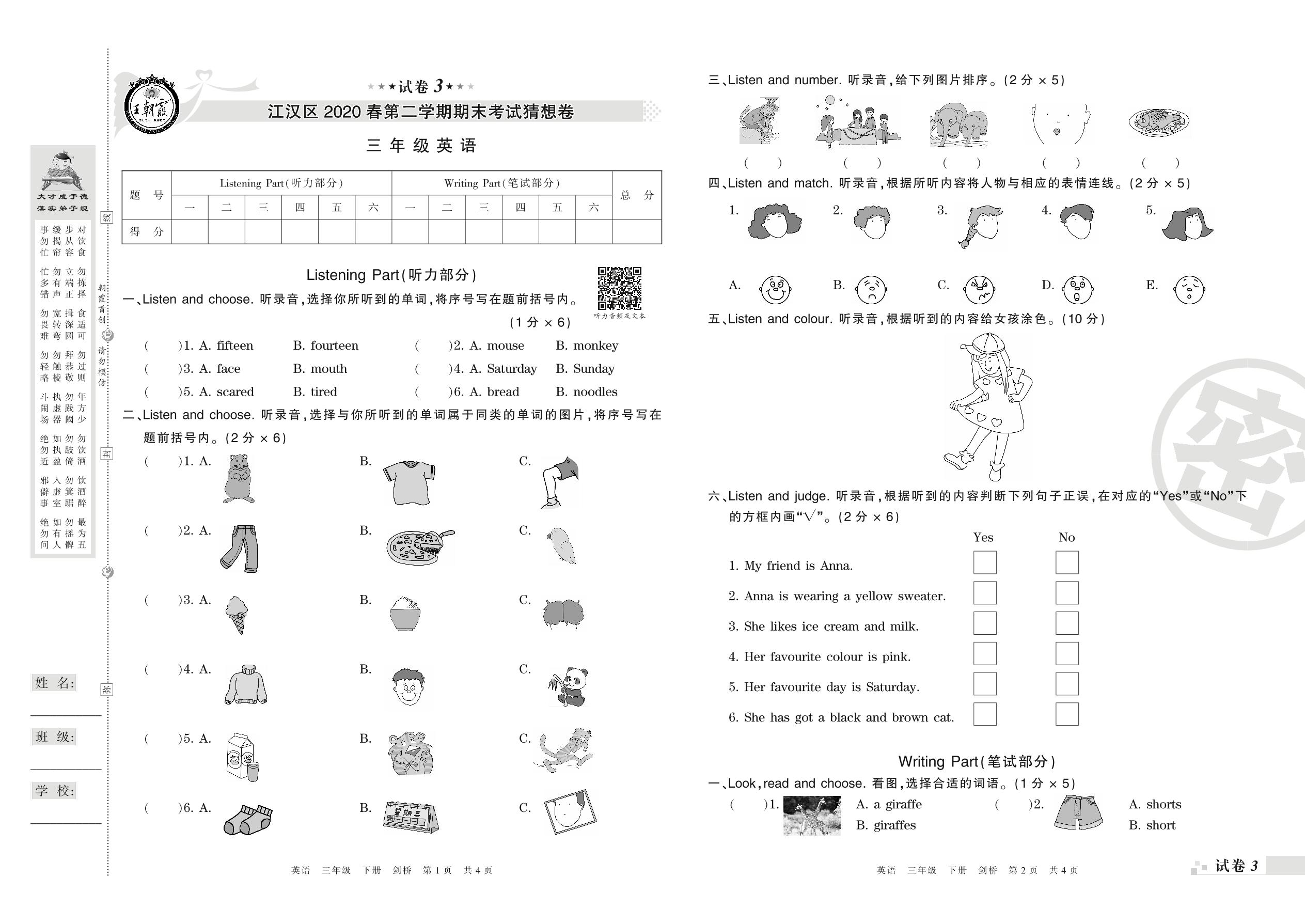 2018-2019学年第二学期武汉市江汉区三年级英语试卷(剑桥版)【3】