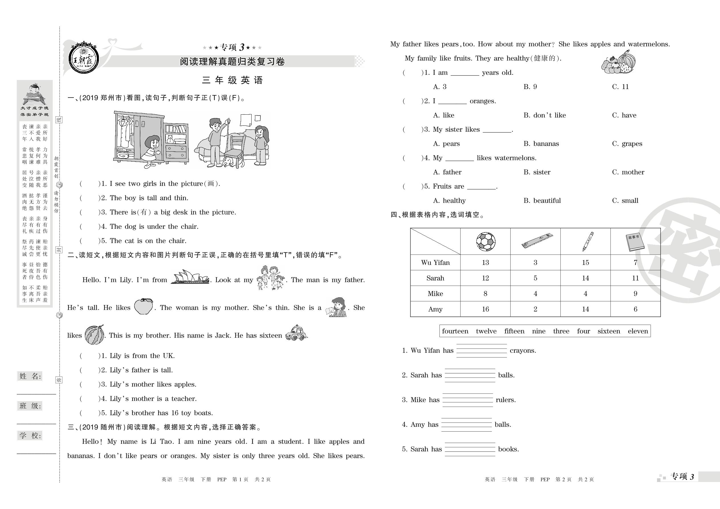 王朝霞期末专项卷——阅读理解真题归类复习卷、新颖题速递:绘本阅读三年级下册英语(PEP版)_R210806185429【0】