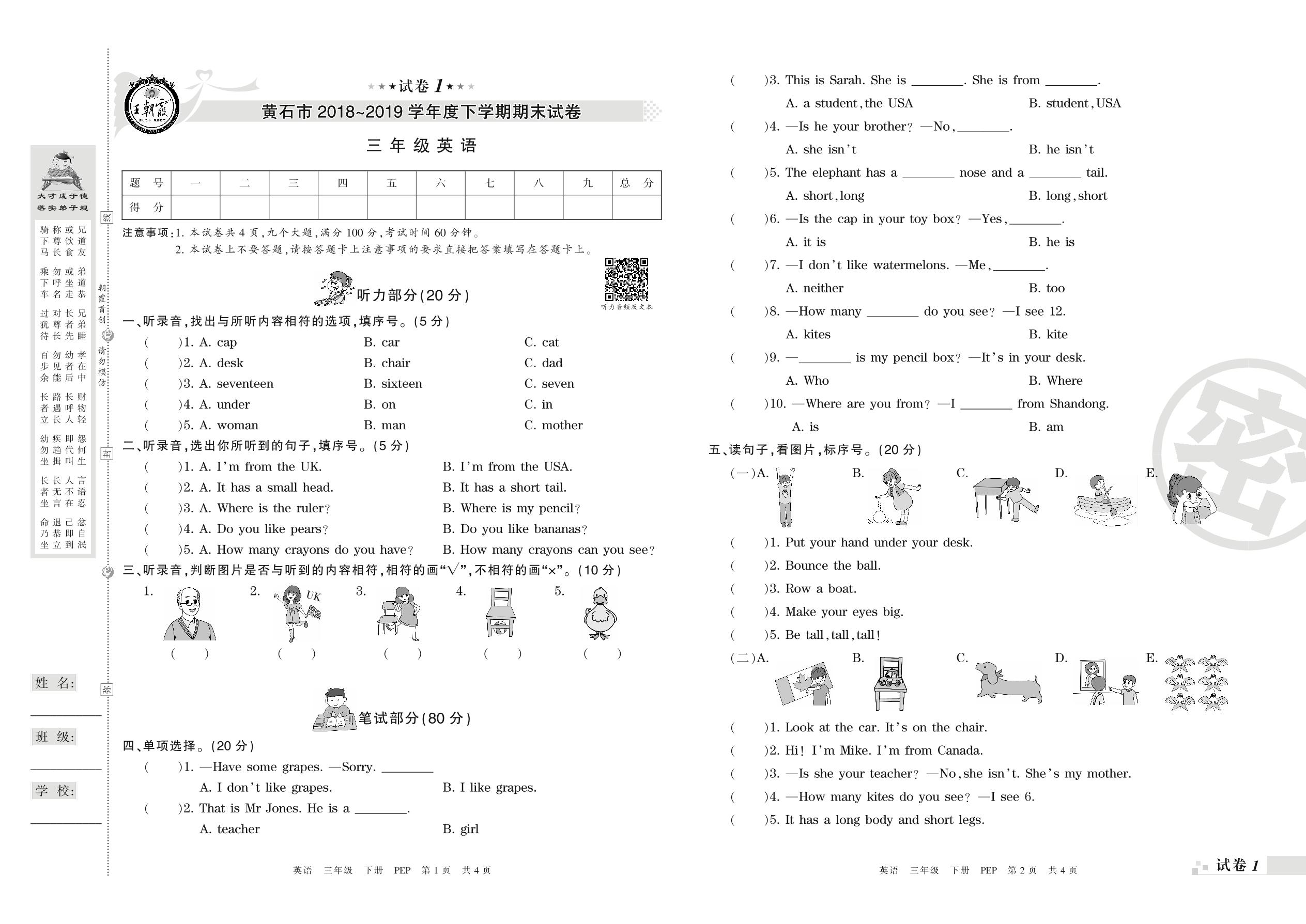 2018-2019学年第二学期黄石市三年级英语试卷(PEP版)【1】