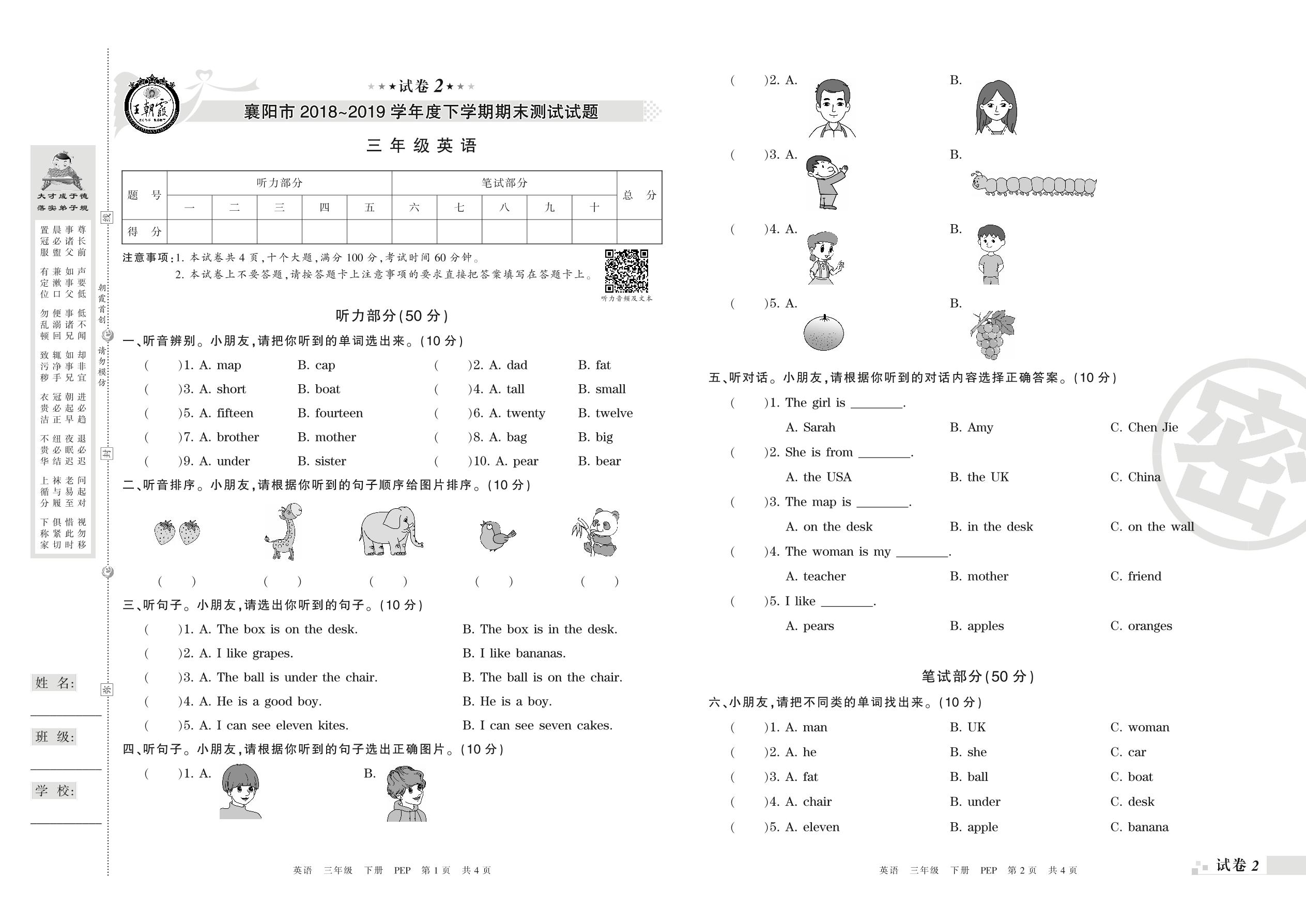 2018-2019学年第二学期襄阳市三年级英语试卷(PEP版)【2】
