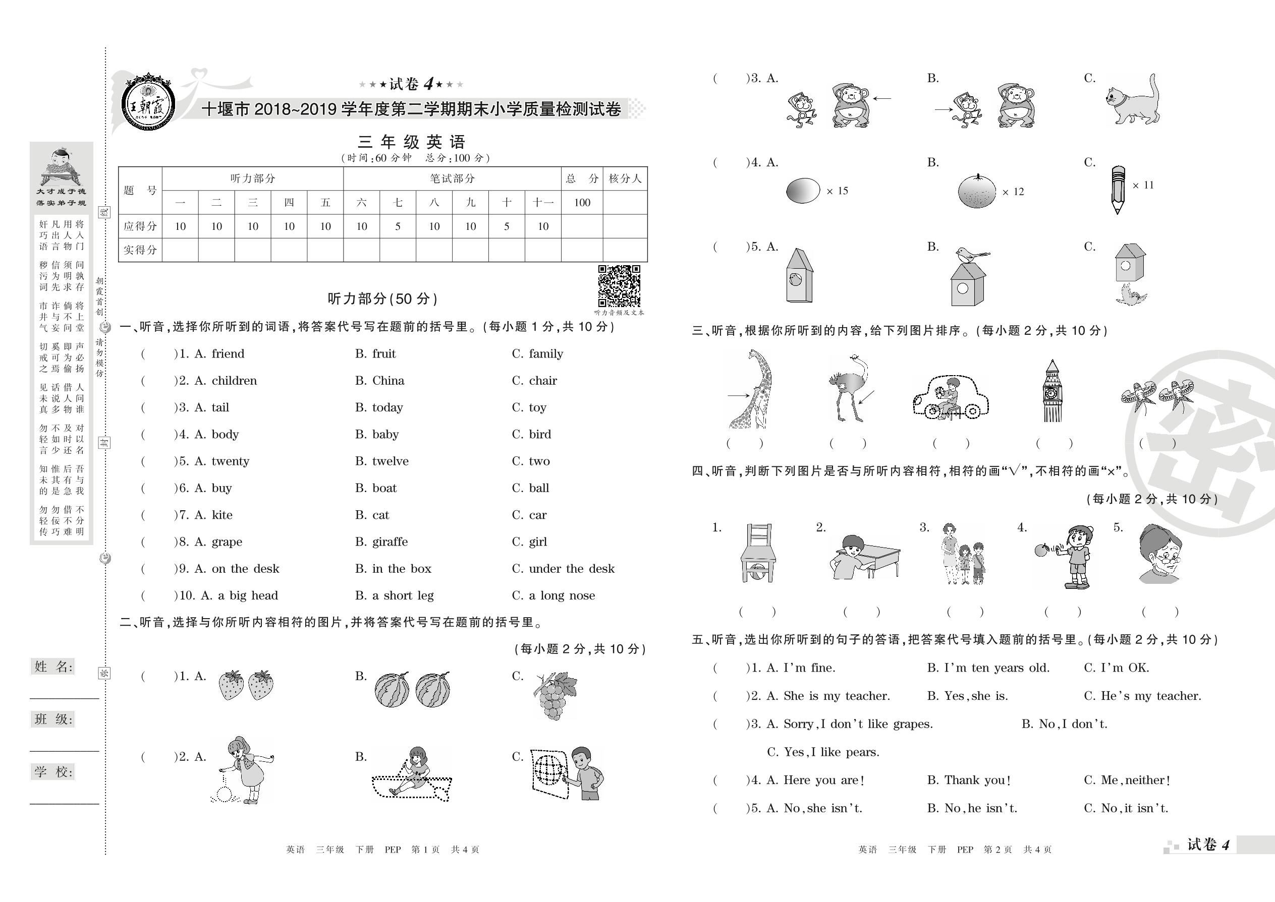 2018-2019学年第二学期十堰市三年级英语试卷(PEP版)【4】
