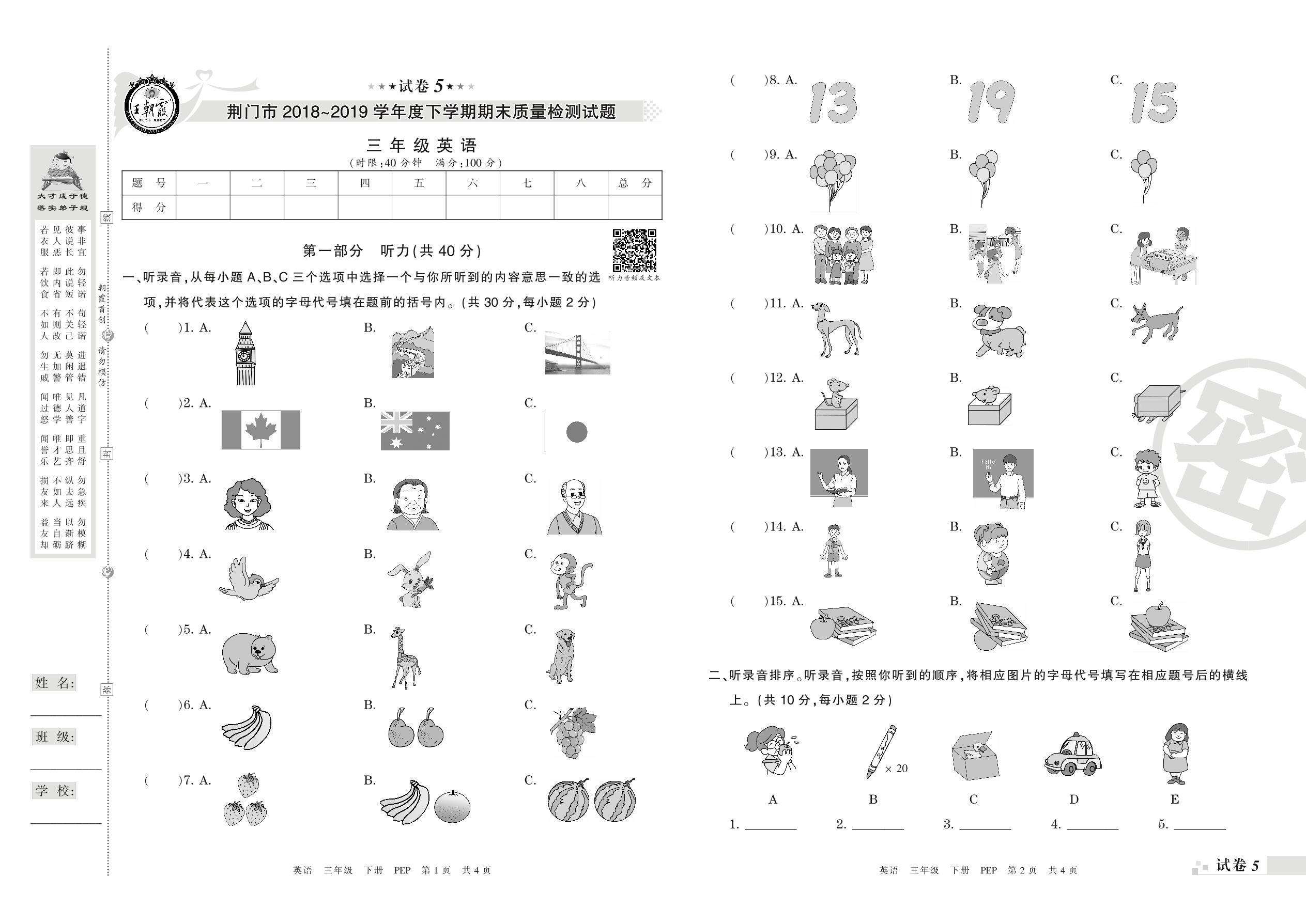 2018-2019学年第二学期荆门市三年级英语试卷(PEP版)【5】