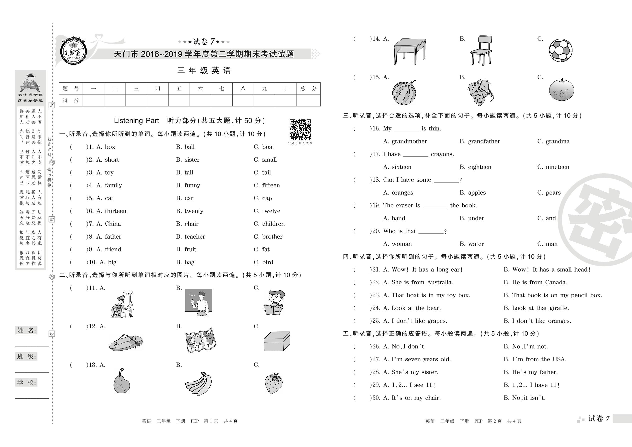 2018-2019学年第二学期天门市三年级英语试卷(PEP版)【7】