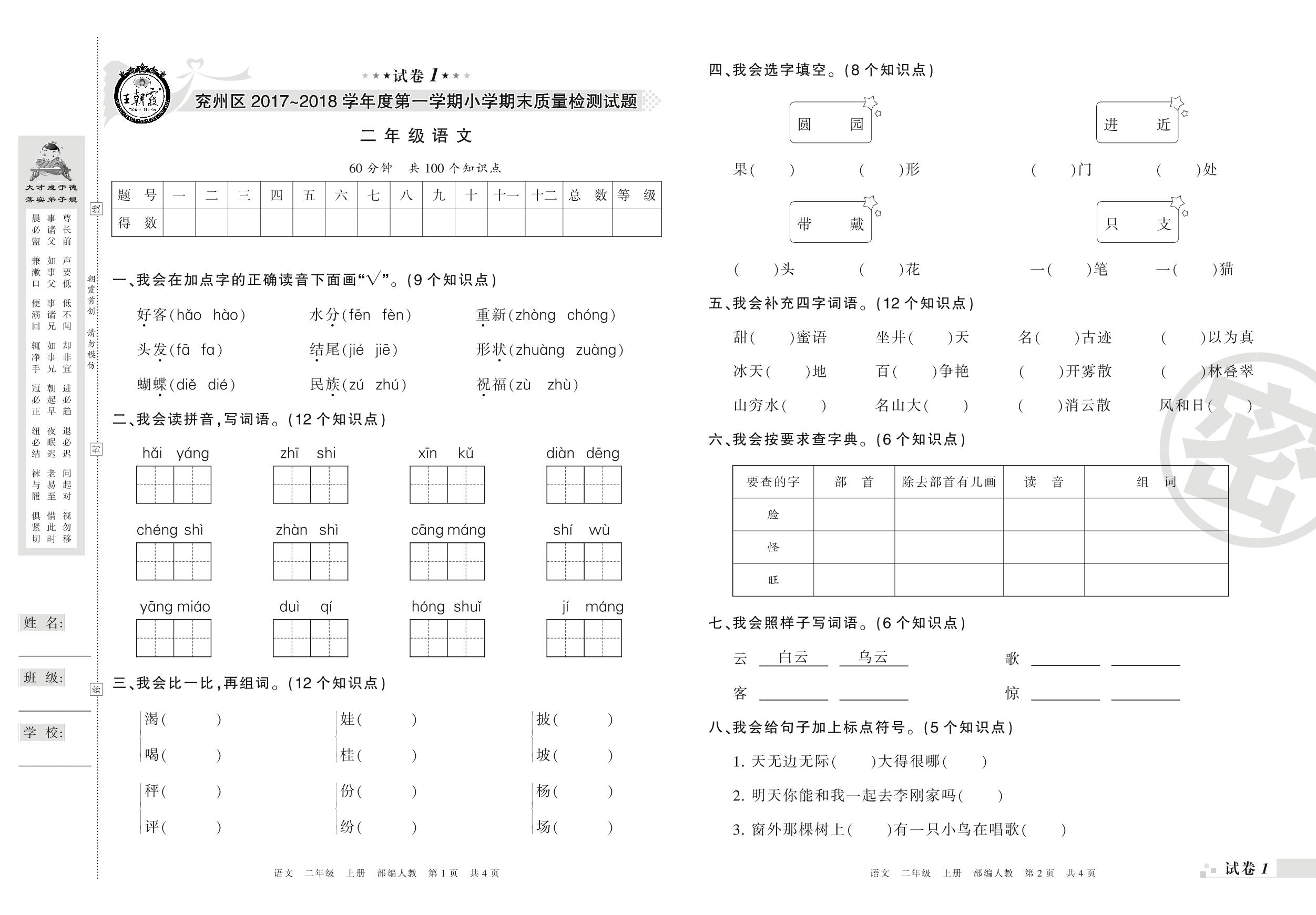 2017-2018学年第一学期济宁市兖州区二年级语文试卷(人教版)【1】