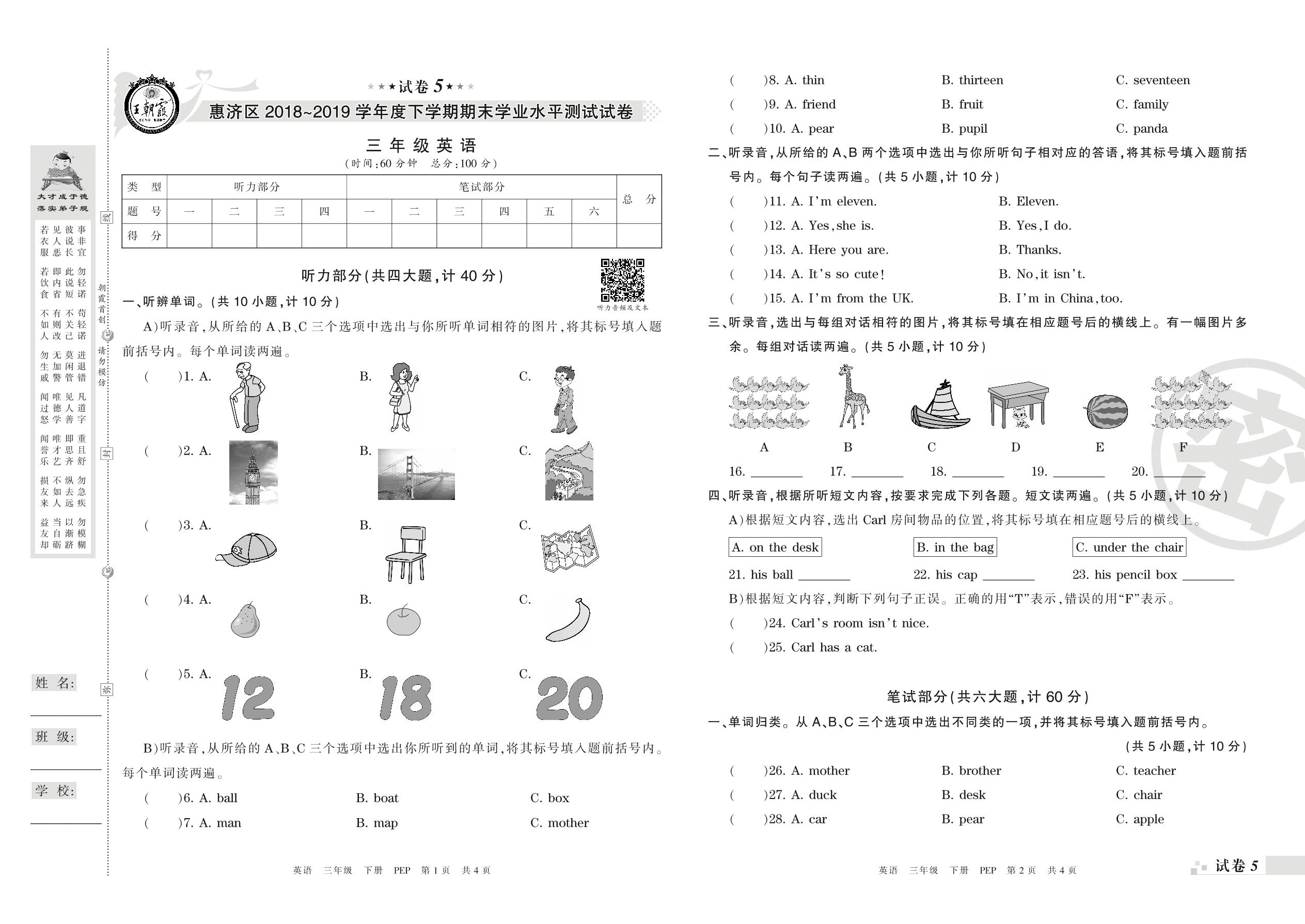 2018-2019学年第二学期郑州市惠济区三年级英语试卷(PEP版)【5】
