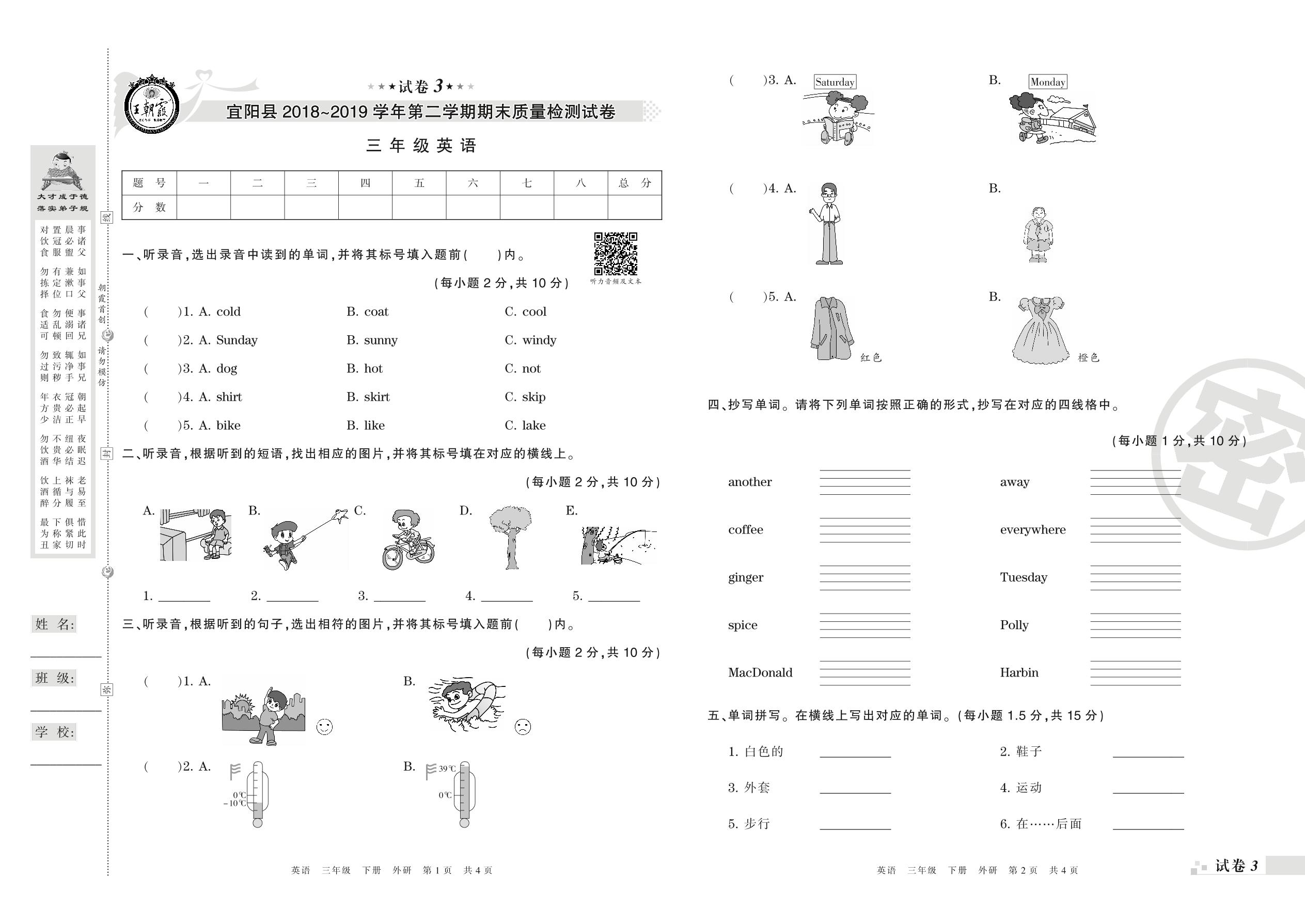 2018-2019学年第二学期洛阳市宜阳县三年级英语试卷(外研版)【3】