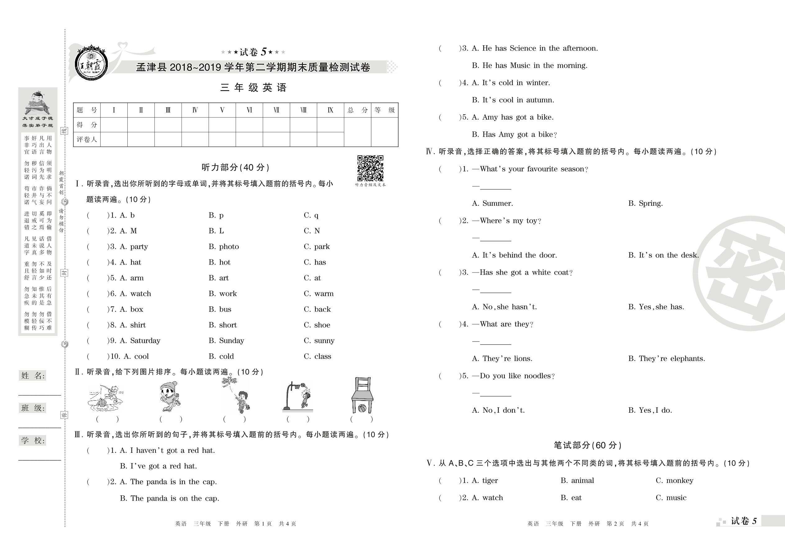 2018-2019学年第二学期洛阳市孟津县三年级英语试卷(外研版)【5】