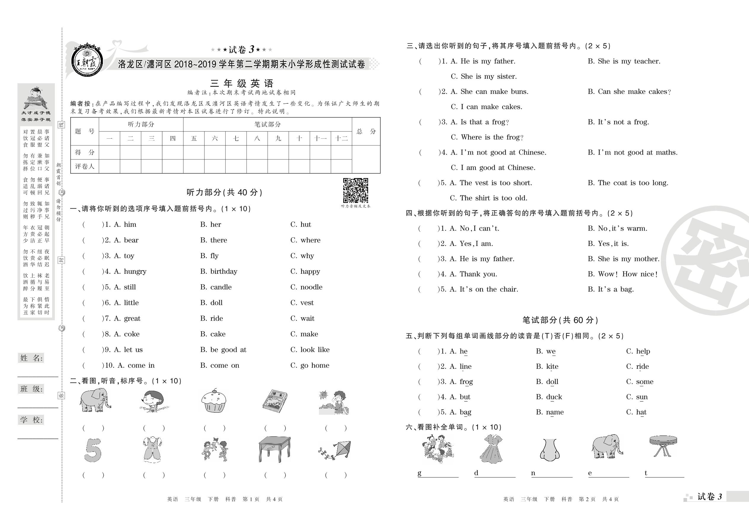 2018-2019学年第二学期洛阳市洛龙区、瀍河区三年级英语试卷(科普版)【3】