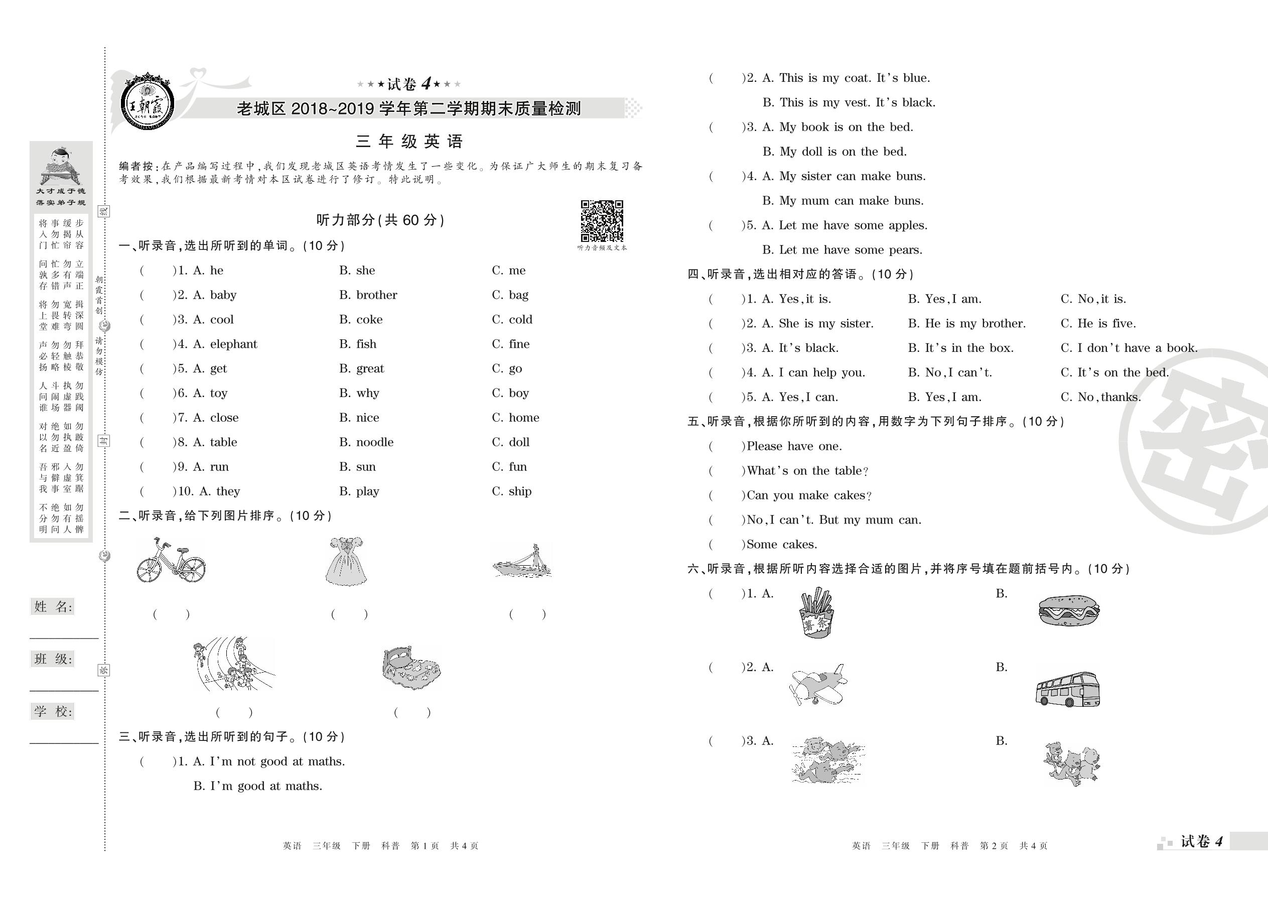 2018-2019学年第二学期洛阳市老城区三年级英语试卷(科普版)【4】