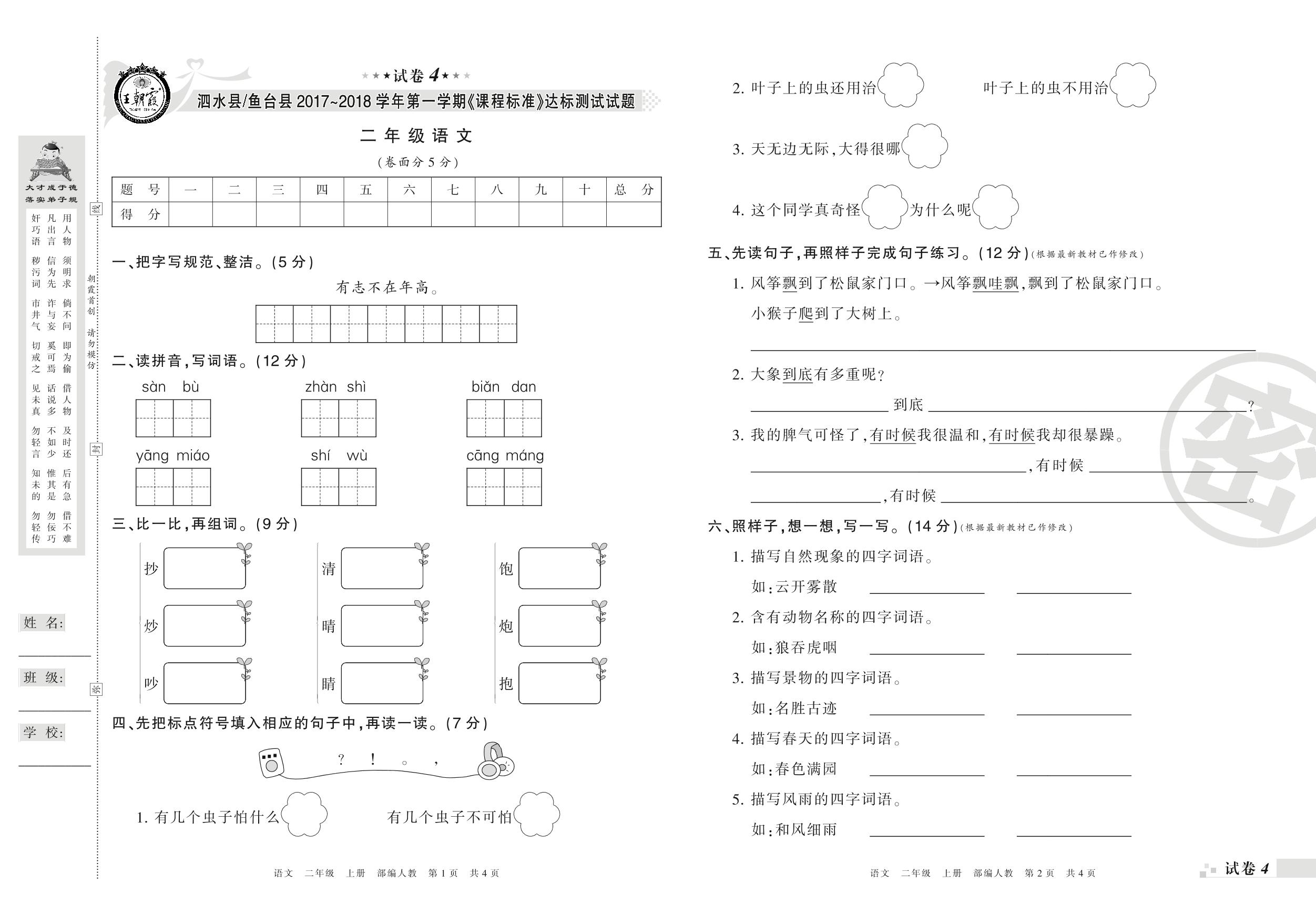 2017-2018学年第一学期济宁市泗水县(鱼台县)二年级语文试卷(人教版)【4】