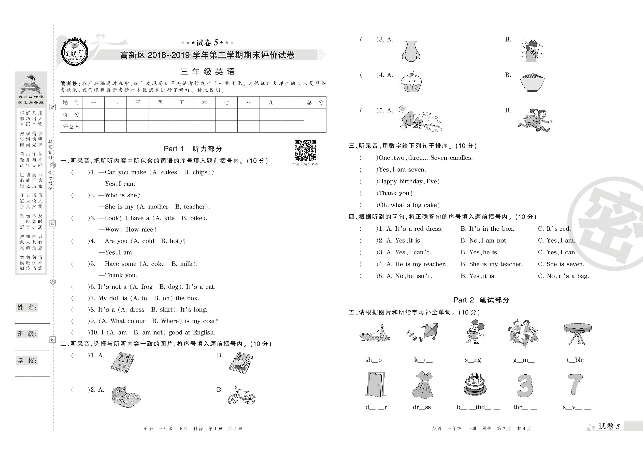 2018-2019学年第二学期洛阳市高新区三年级英语试卷(科普版)【5】