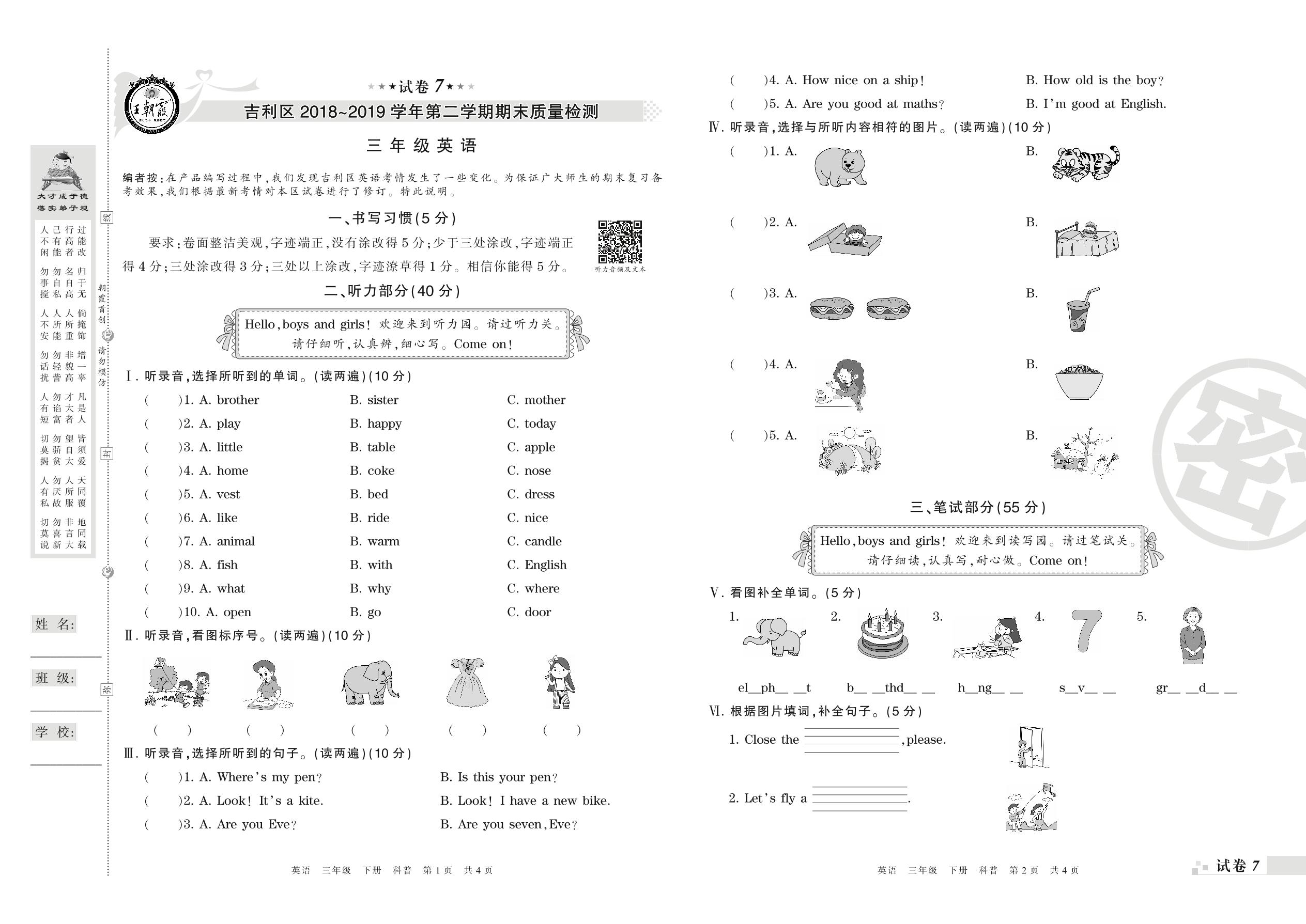 2018-2019学年第二学期洛阳市吉利区三年级英语试卷(科普版)【7】
