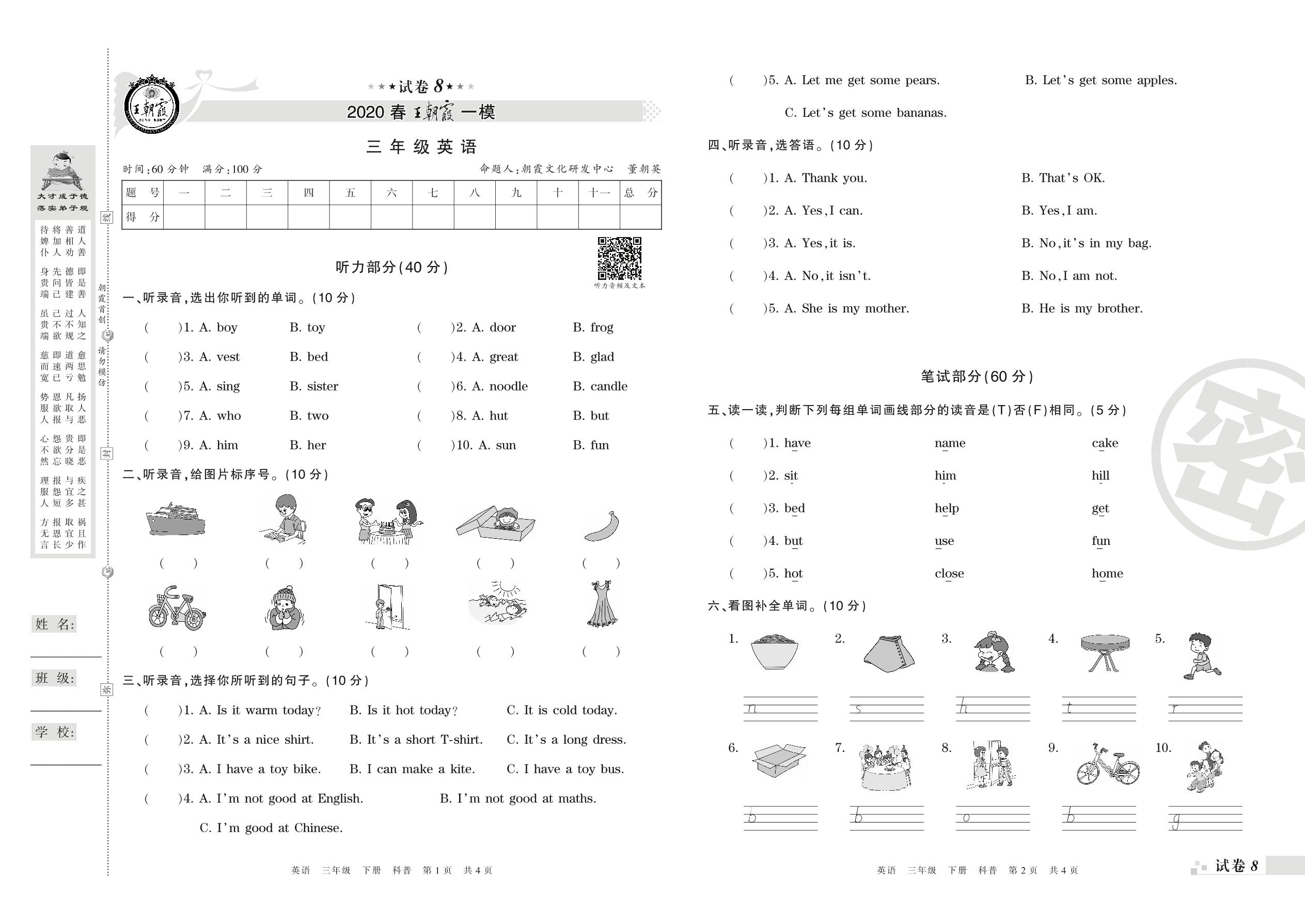 王朝霞期末模拟卷三年级下册英语(科普版)_R210806185806【8】
