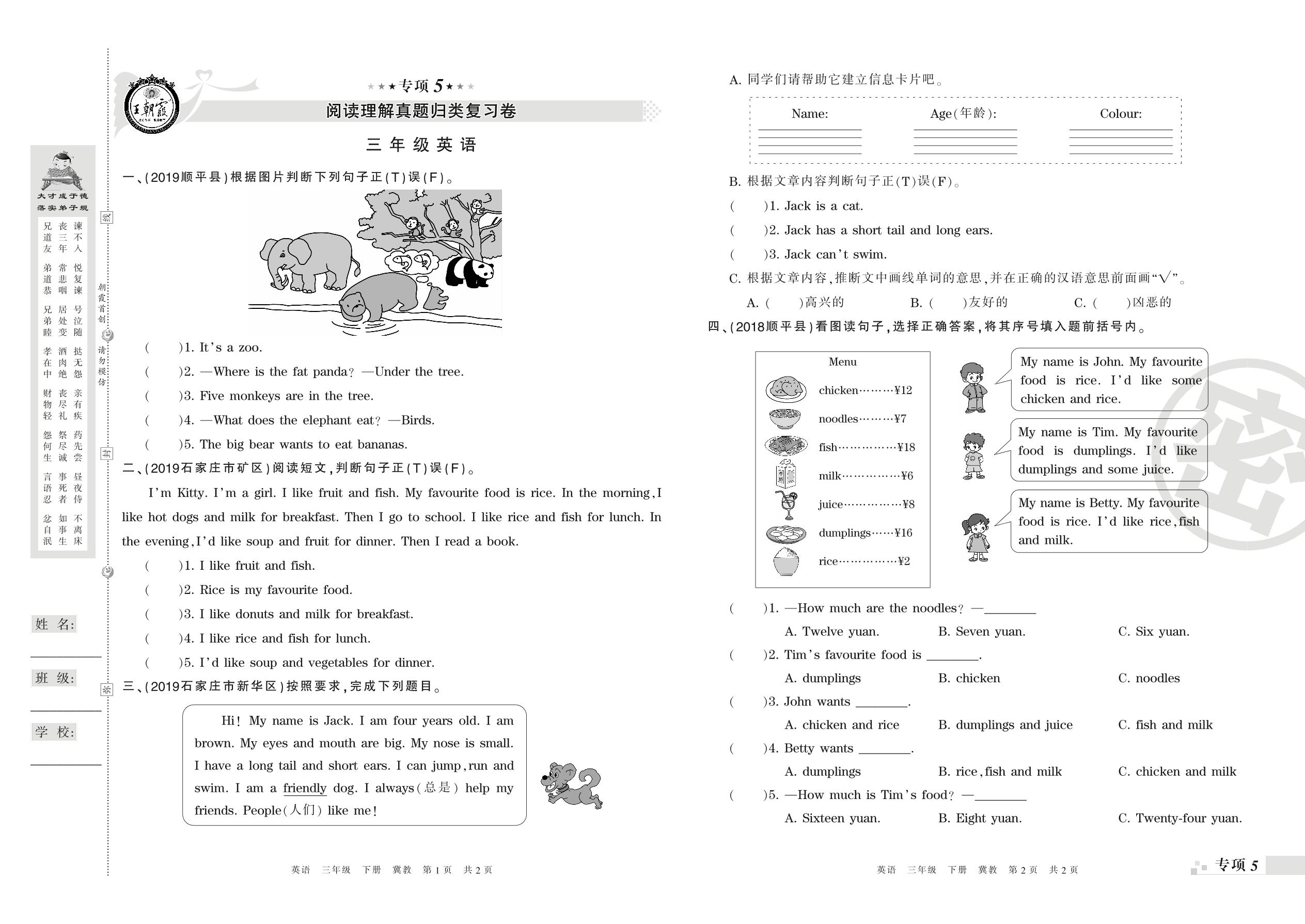 王朝霞期末专项卷——阅读理解真题归类复习卷、新颖题速递:绘本阅读三年级下册英语(冀教版)_R210806185842【0】