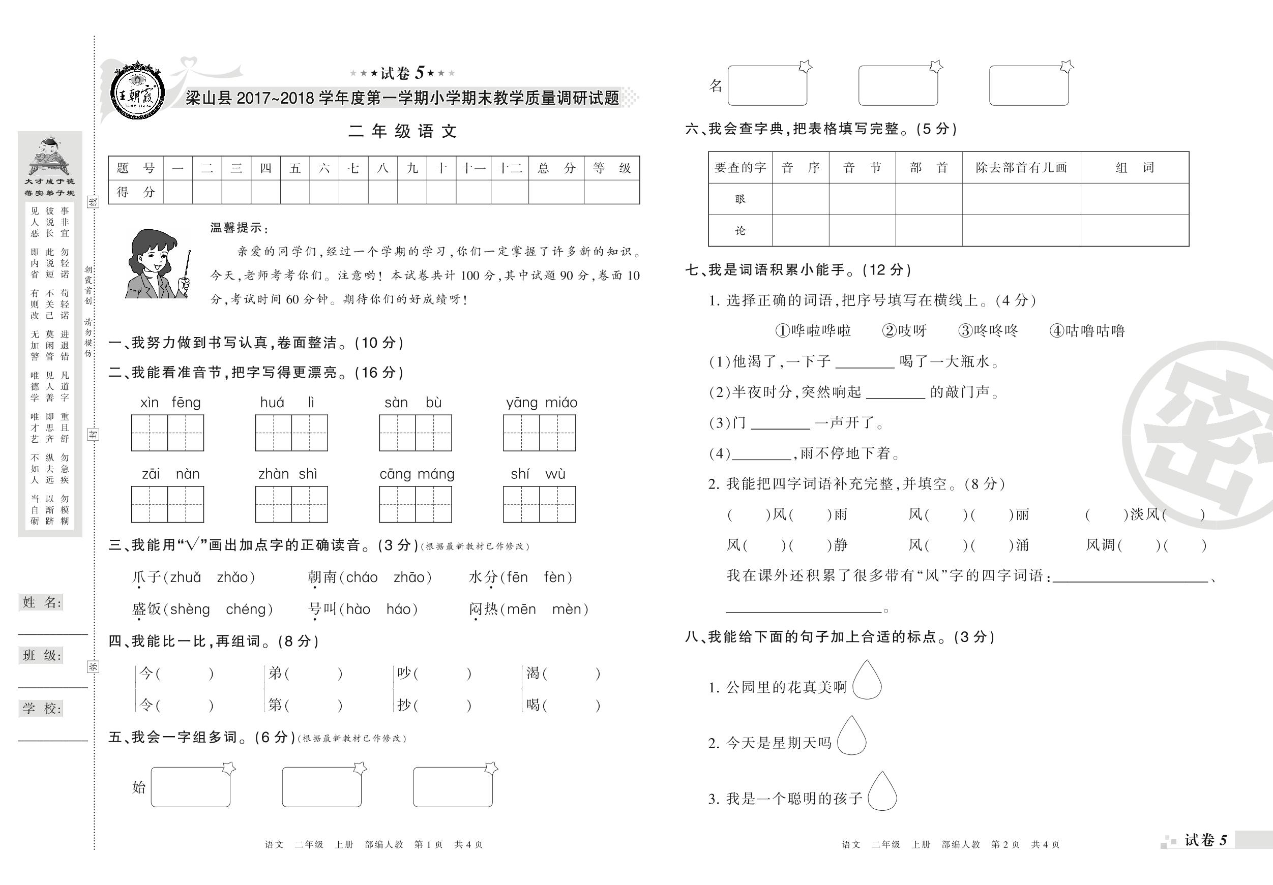 2017-2018学年第一学期济宁市梁山县二年级语文试卷(人教版)【5】