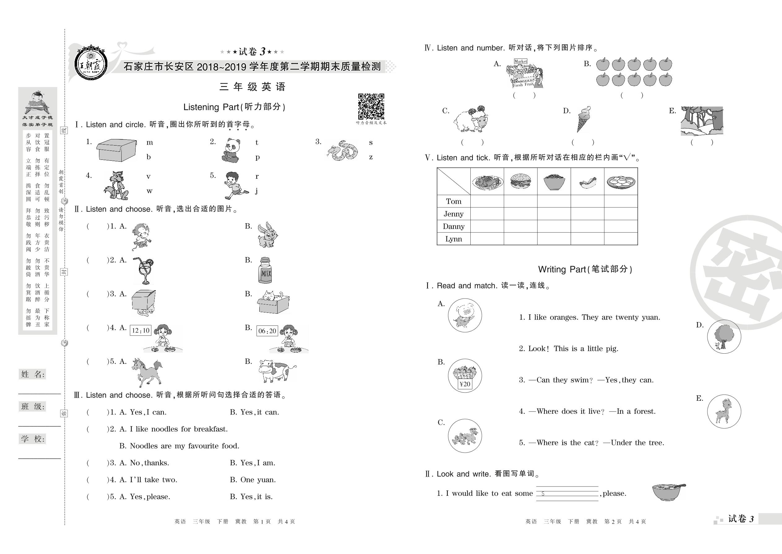 2018-2019学年第二学期石家庄市长安区三年级英语试卷(冀教版)【3】