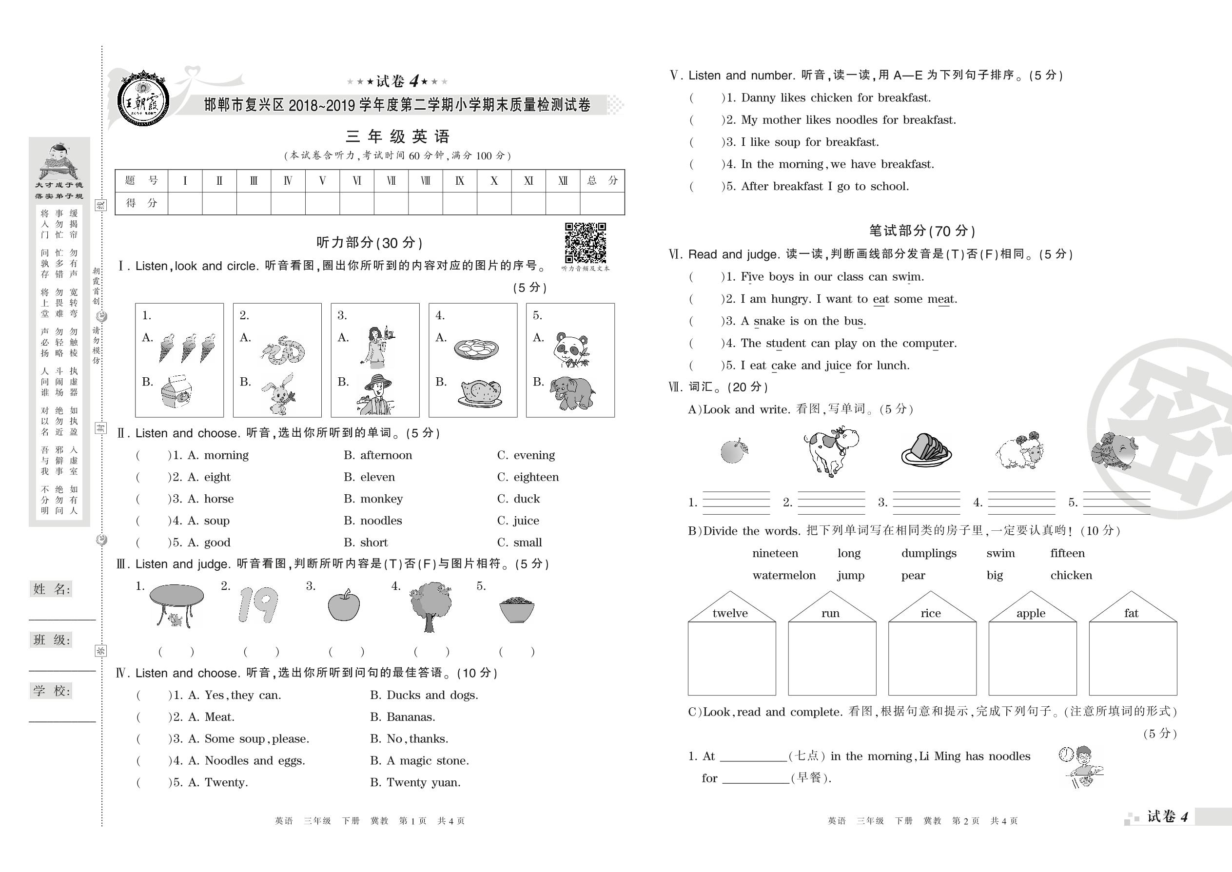 2018-2019学年第二学期邯郸市复兴区三年级英语试卷(冀教版)【4】