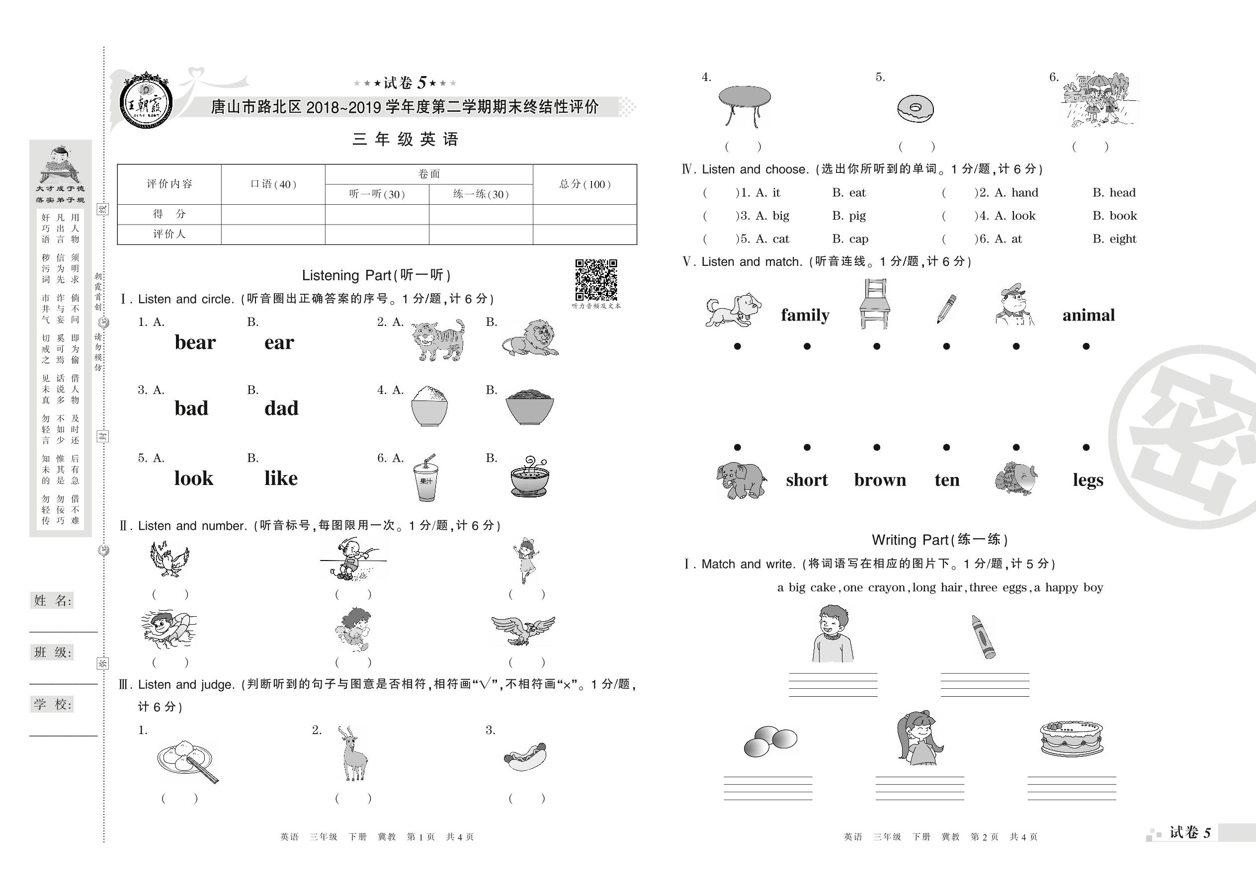 2018-2019学年第二学期唐山市路北区三年级英语试卷(冀教版)【5】