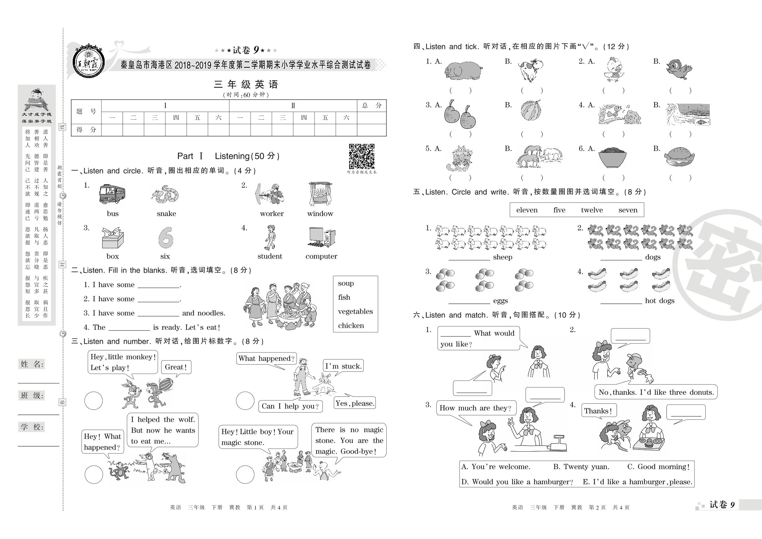 2018-2019学年第二学期秦皇岛市海港区三年级英语试卷(冀教版)【9】
