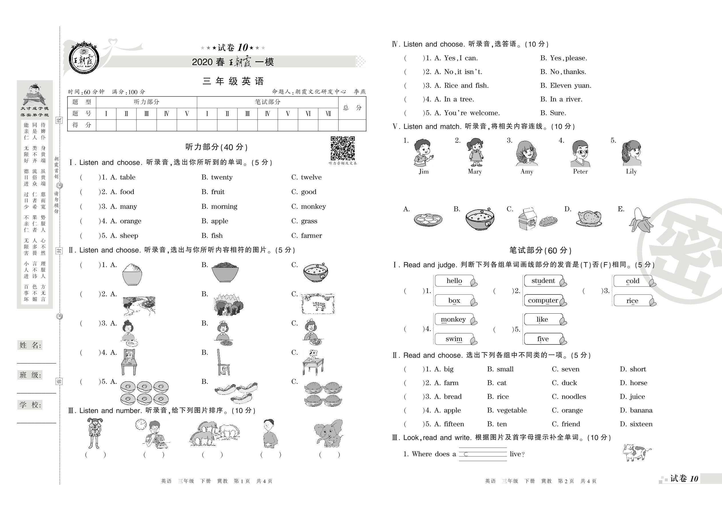 王朝霞期末模拟卷三年级下册英语(冀教版)【10】
