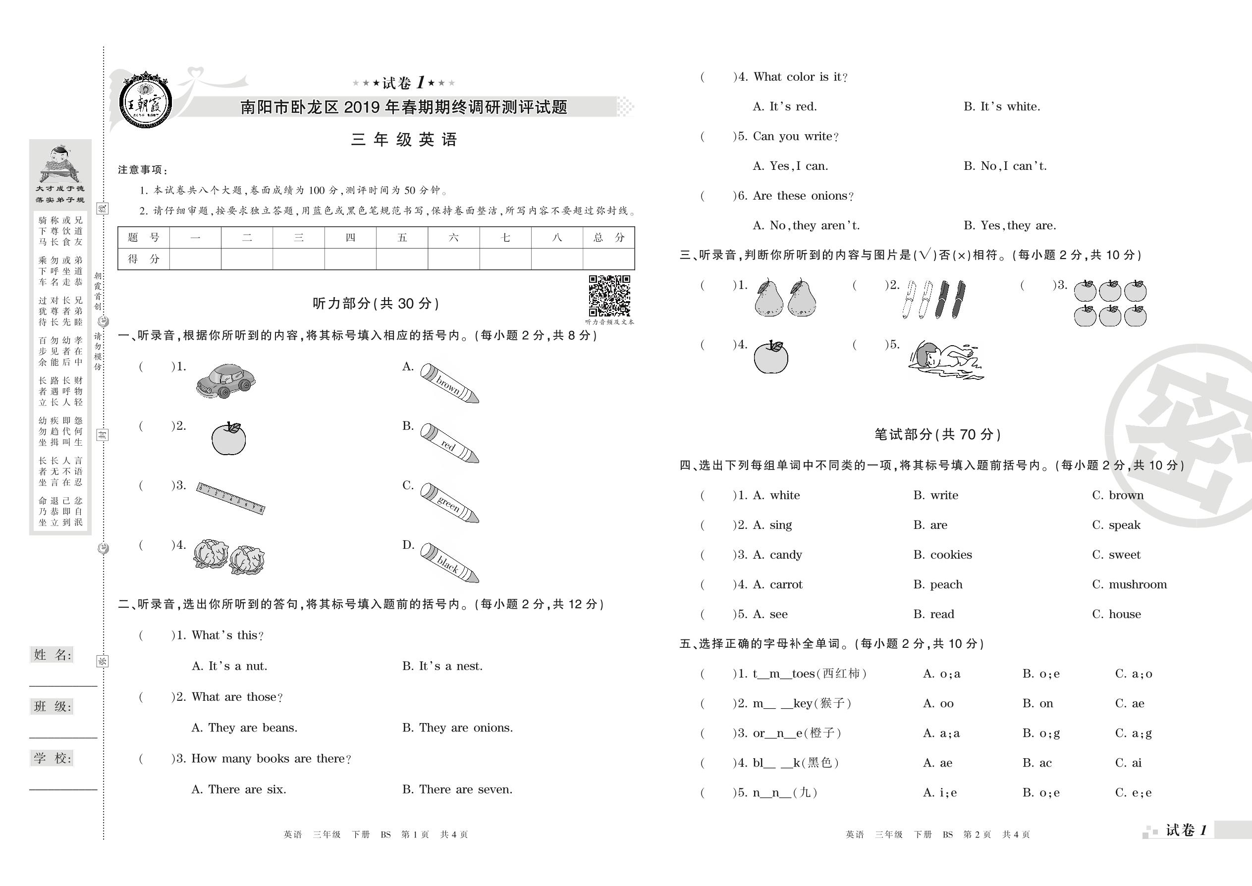 2018-2019学年第二学期南阳市卧龙区三年级英语试卷(北师版)【1】