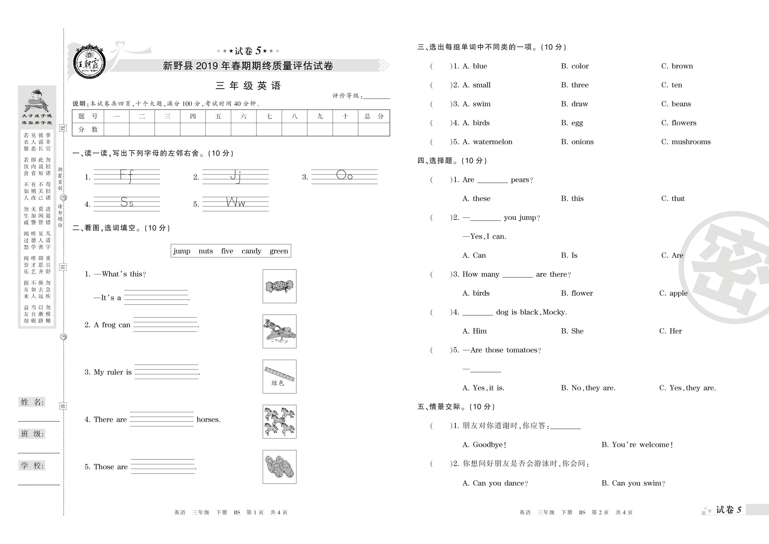 2018-2019学年第二学期南阳市新野县三年级英语试卷(北师版)【5】