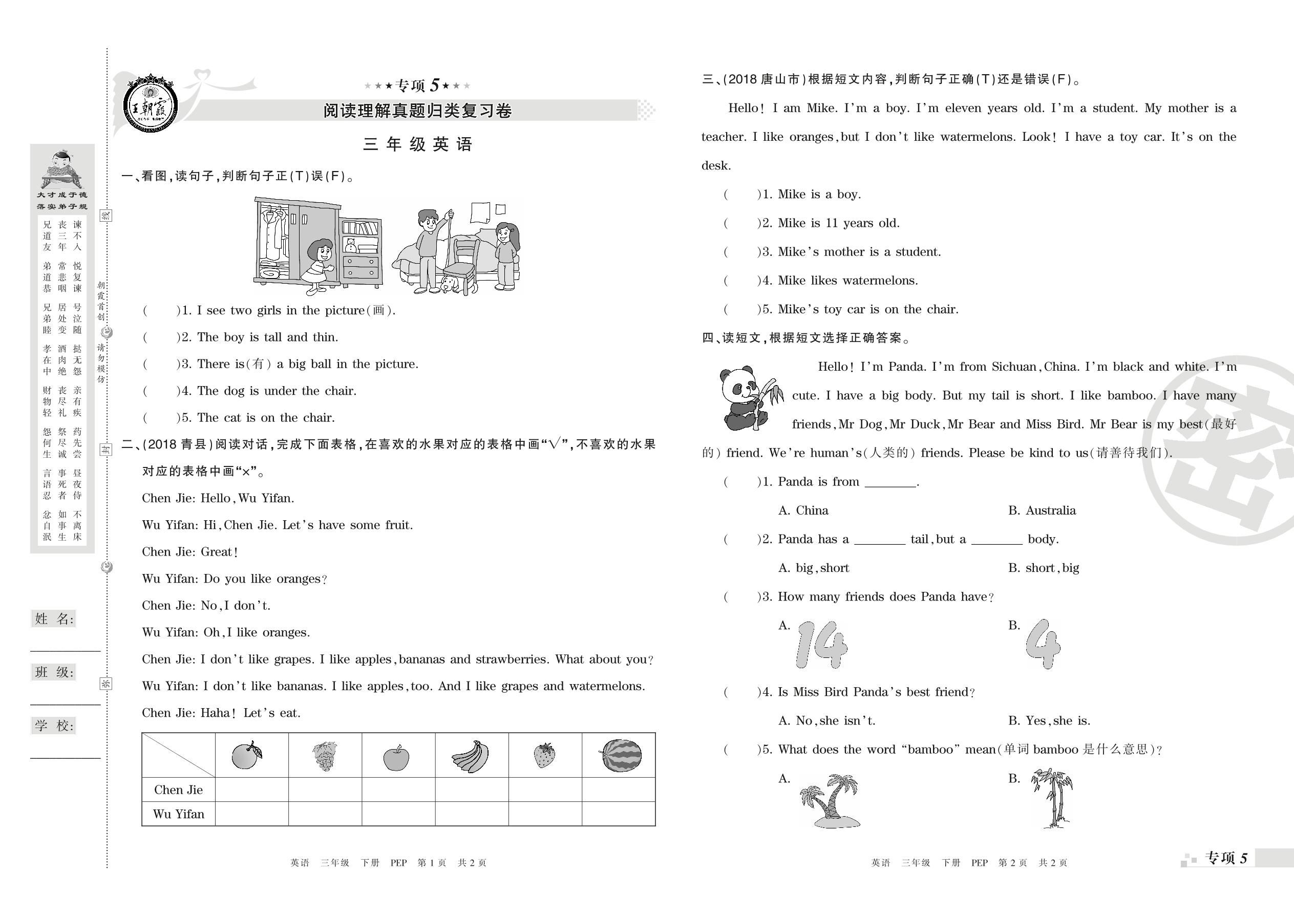王朝霞期末专项卷——阅读理解真题归类复习卷、新颖题速递:绘本阅读三年级下册英语(PEP版)_R210806190027【0】