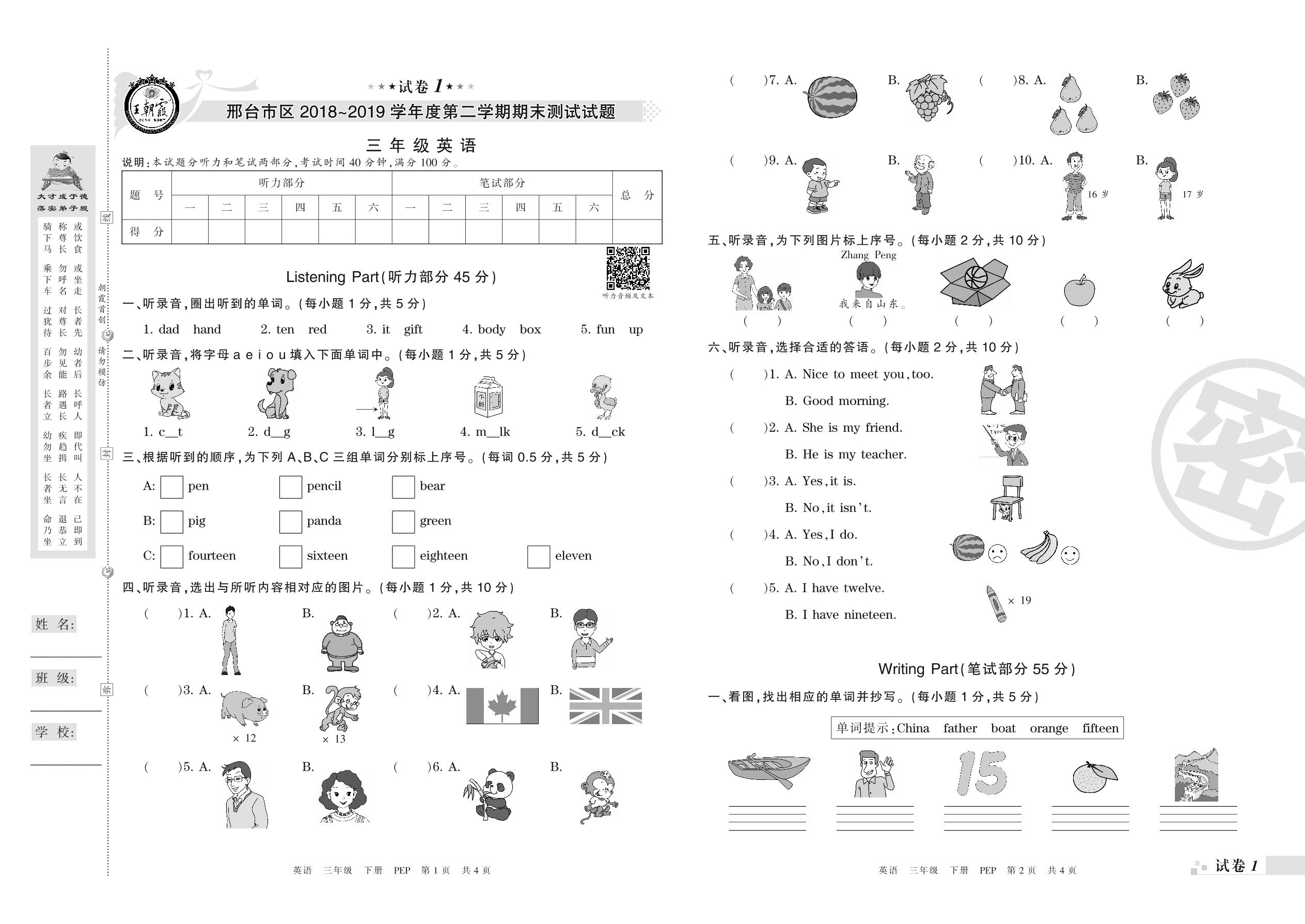 2018-2019学年第二学期邢台市区三年级英语试卷(PEP版)【1】