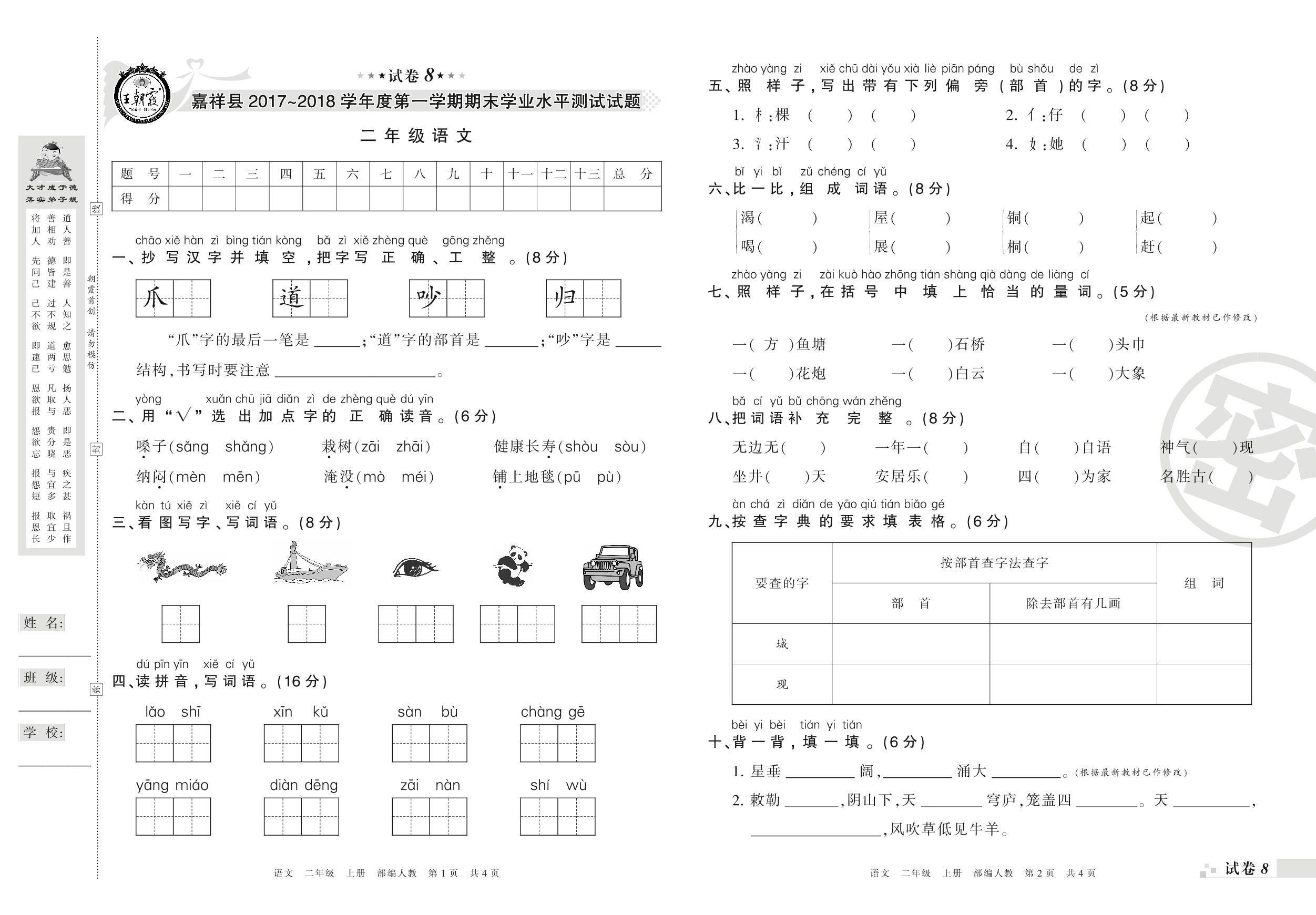 2017-2018学年第一学期济宁市嘉祥县二年级语文试卷(人教版)【8】