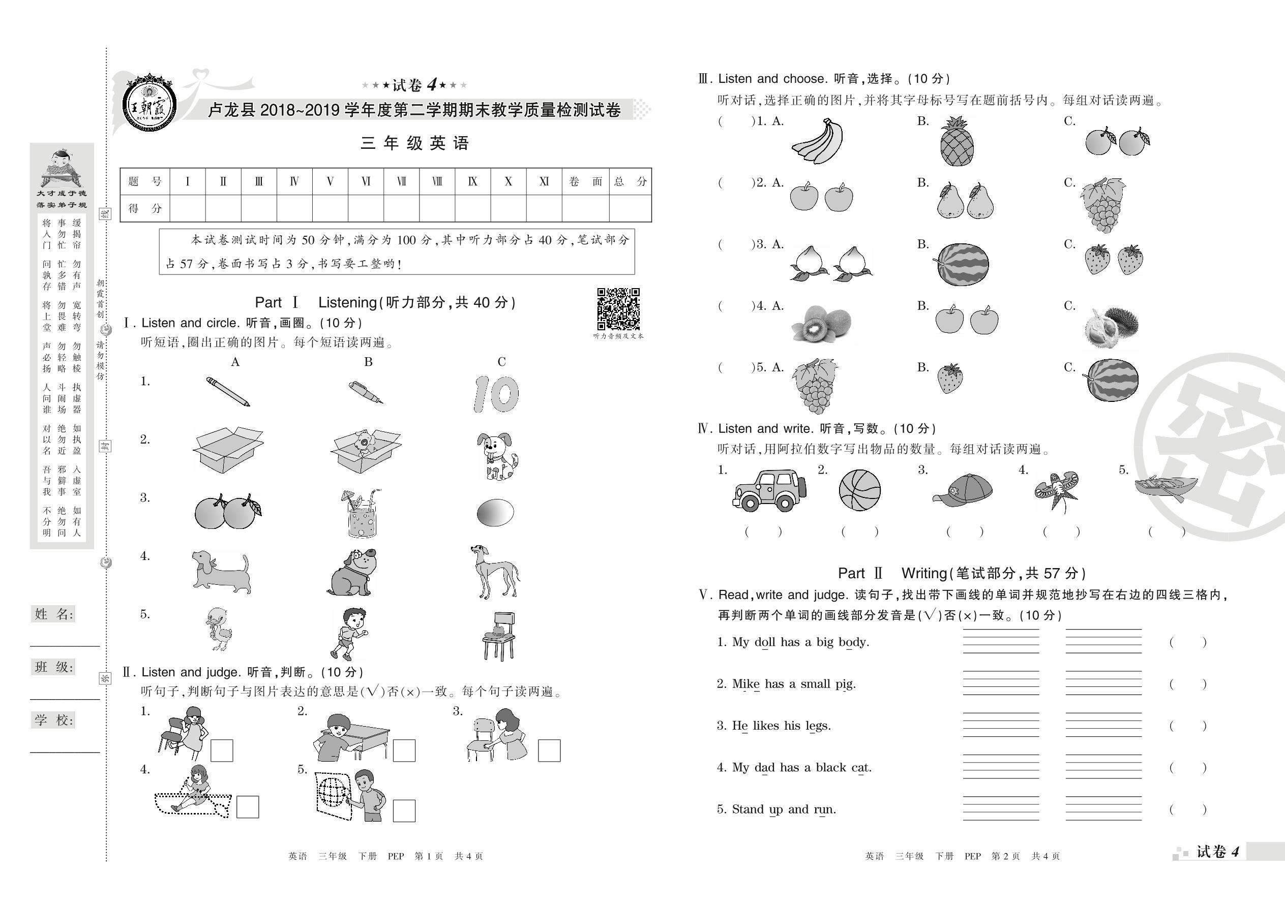 2018-2019学年第二学期秦皇岛市卢龙县三年级英语试卷(PEP版)【4】