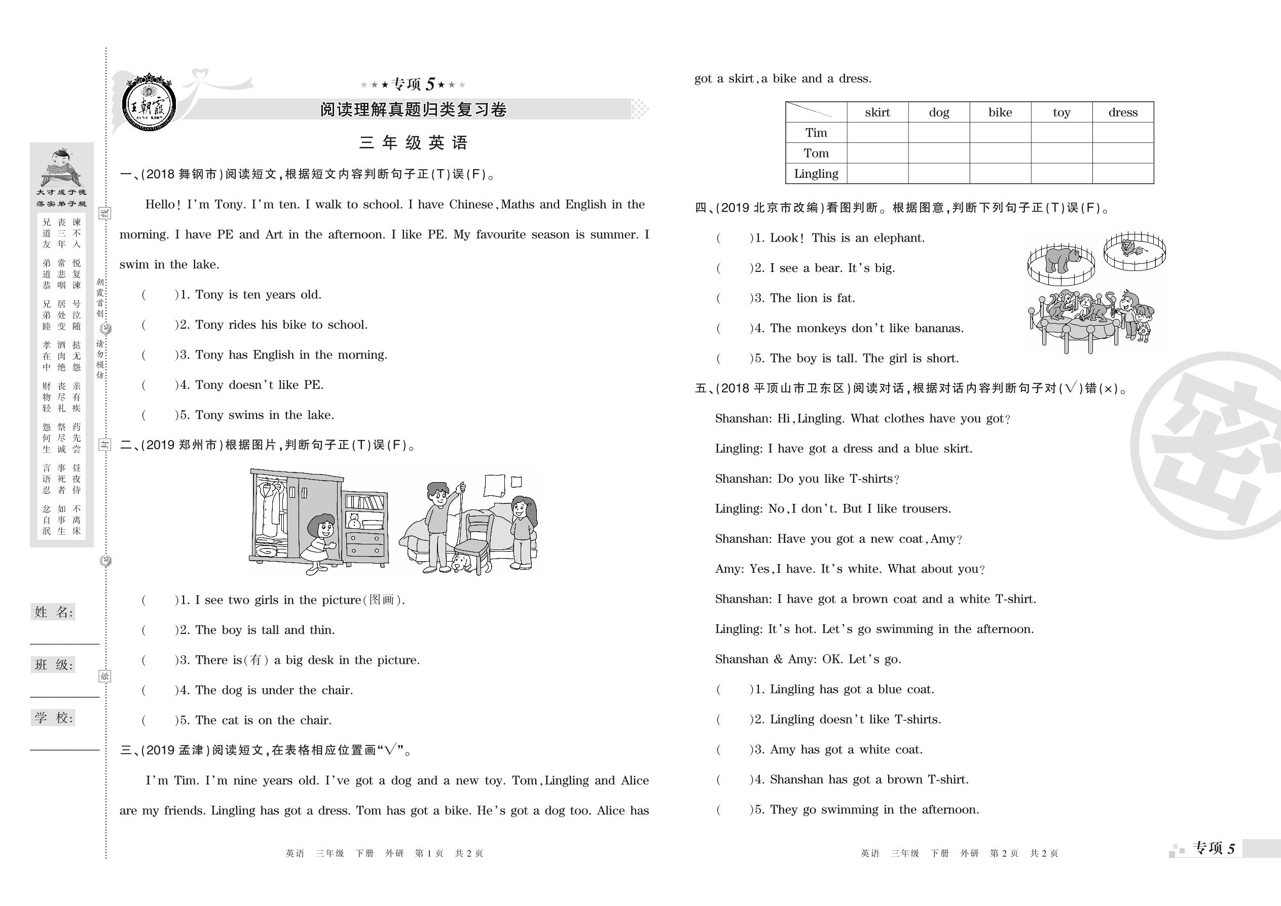 王朝霞期末专项卷——阅读理解真题归类复习卷、新颖题速递:绘本阅读三年级下册英语(外研版)_R210806190109【0】