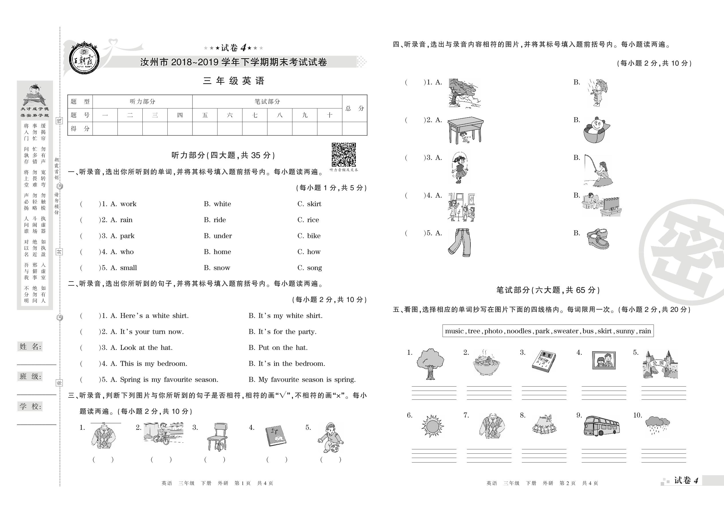 2018-2019学年第二学期汝州市三年级英语试卷(外研版)【4】