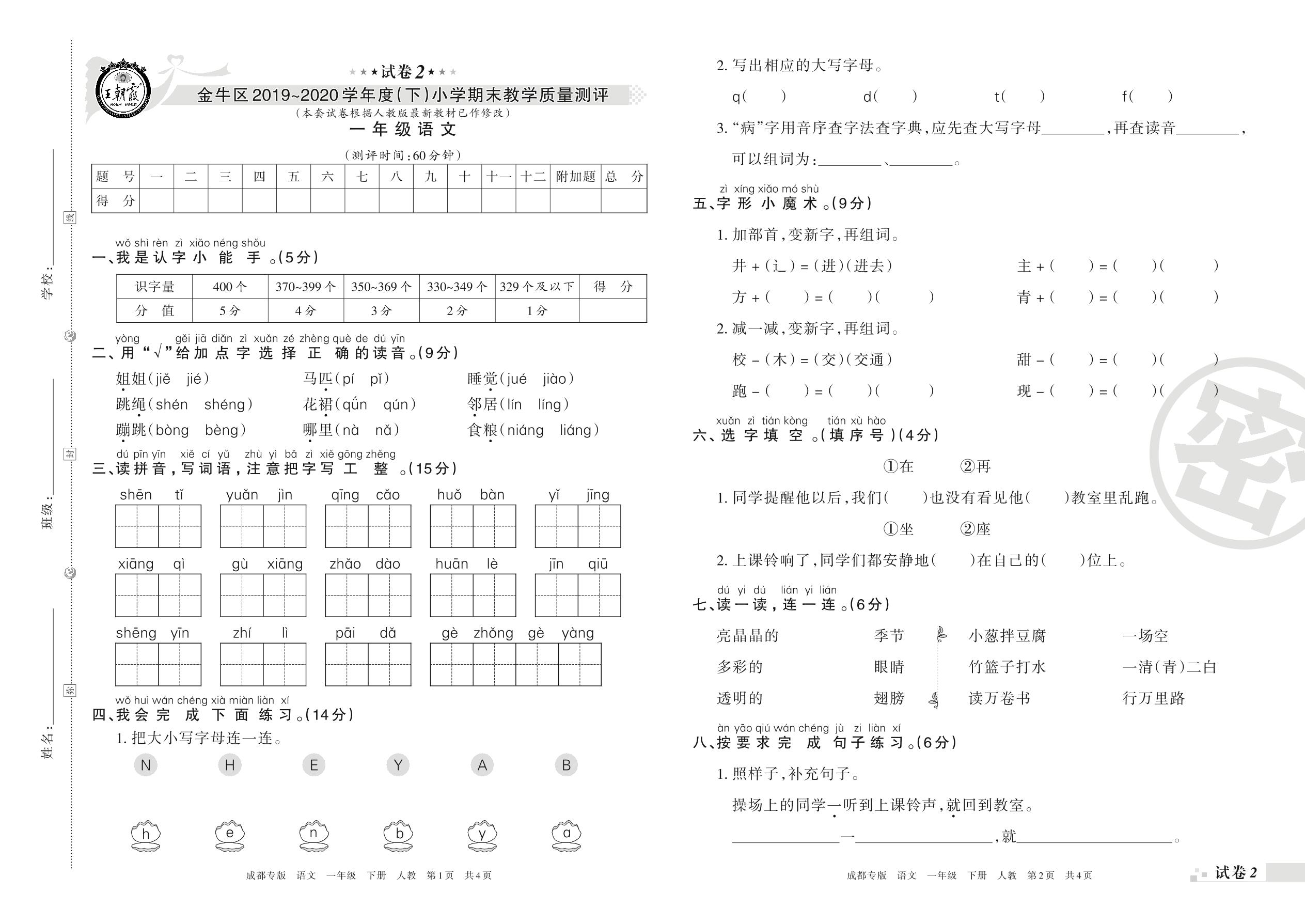 2019-2020学年第二学期成都市金牛区一年级语文试卷(人教版)【2】