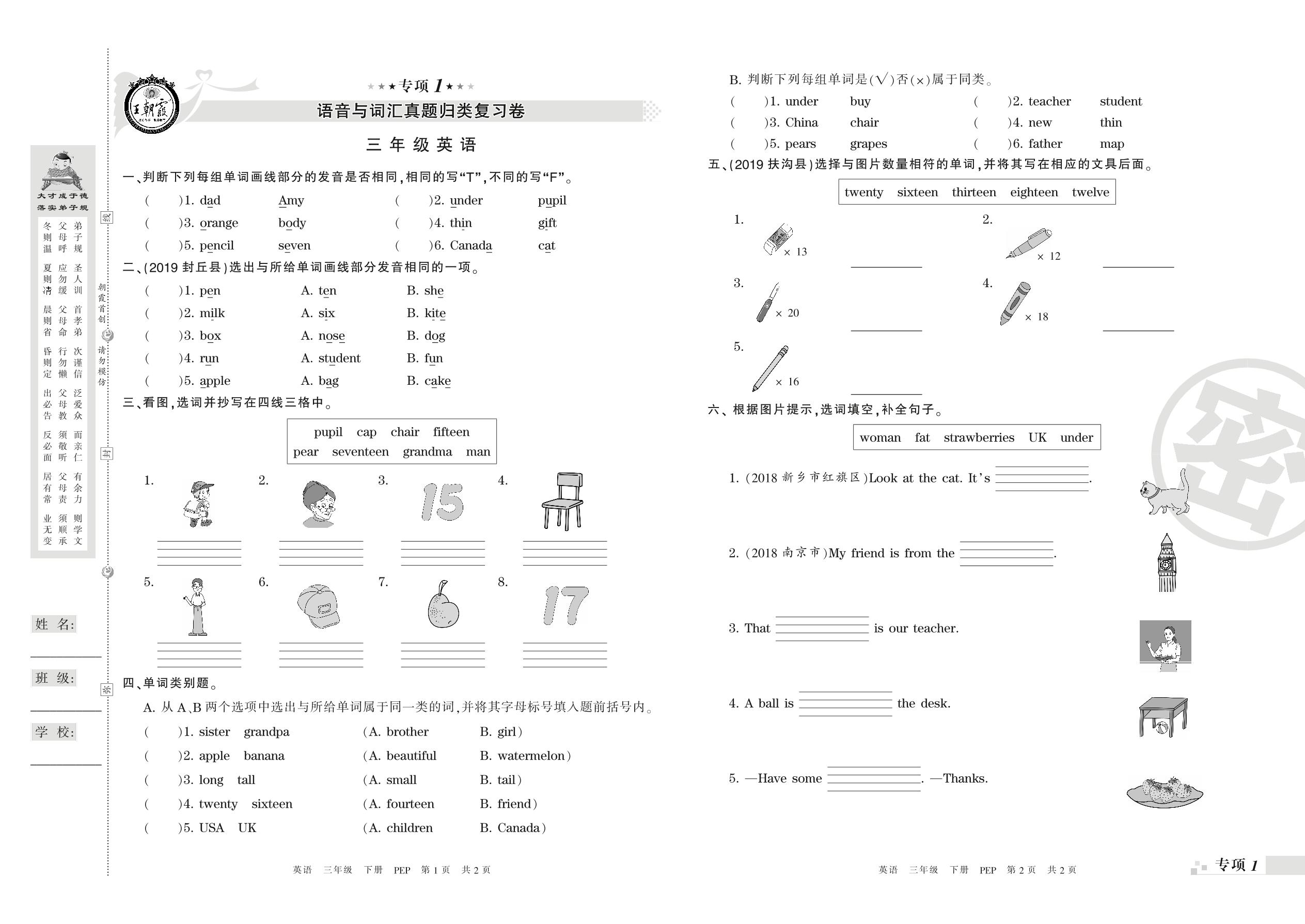 王朝霞期末专项卷——语音与词汇、句子(一)真题归类复习卷三年级下册英语(PEP版)_R210806190257【0】