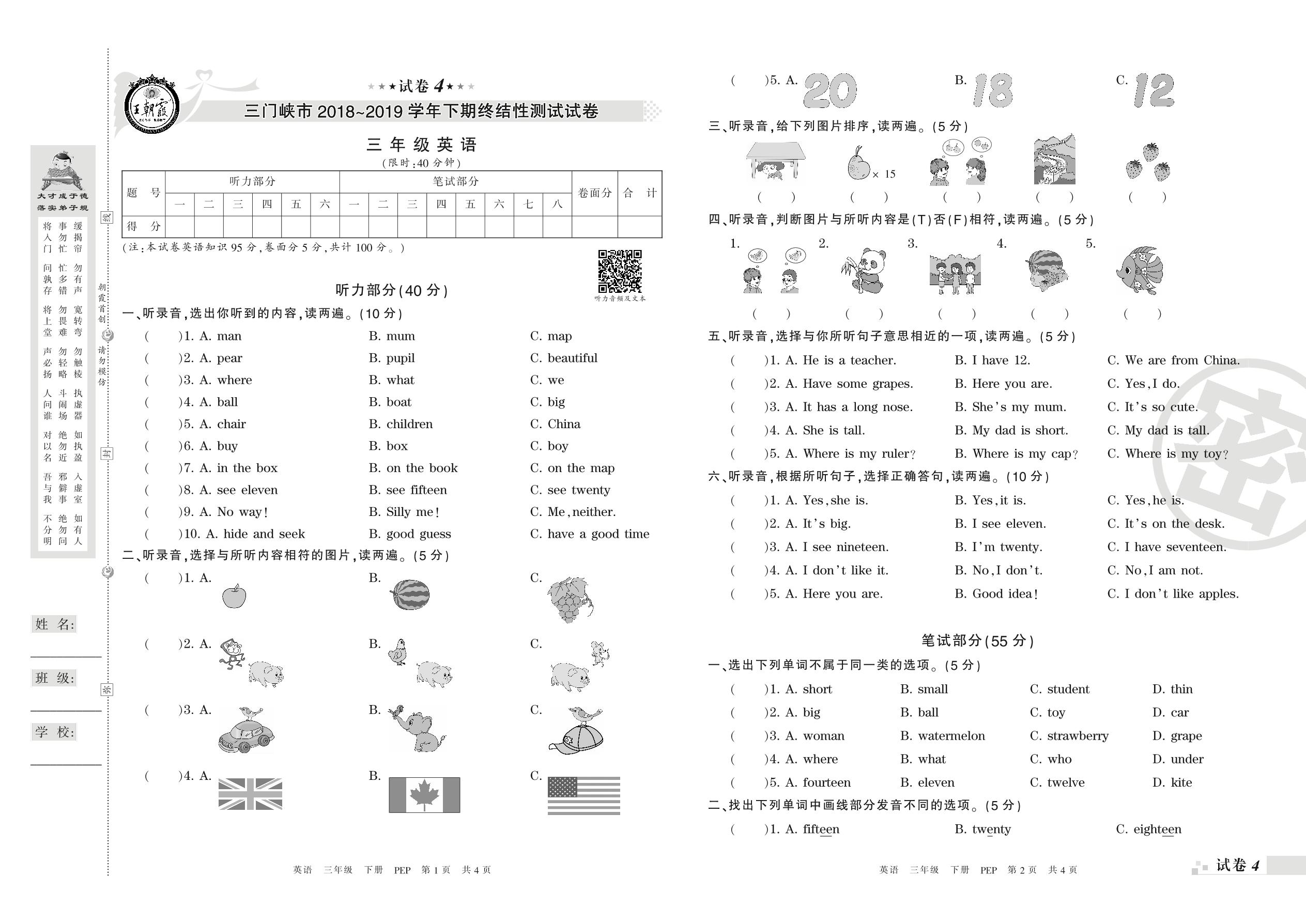 2018-2019学年第二学期三门峡市三年级英语试卷(PEP版)【4】