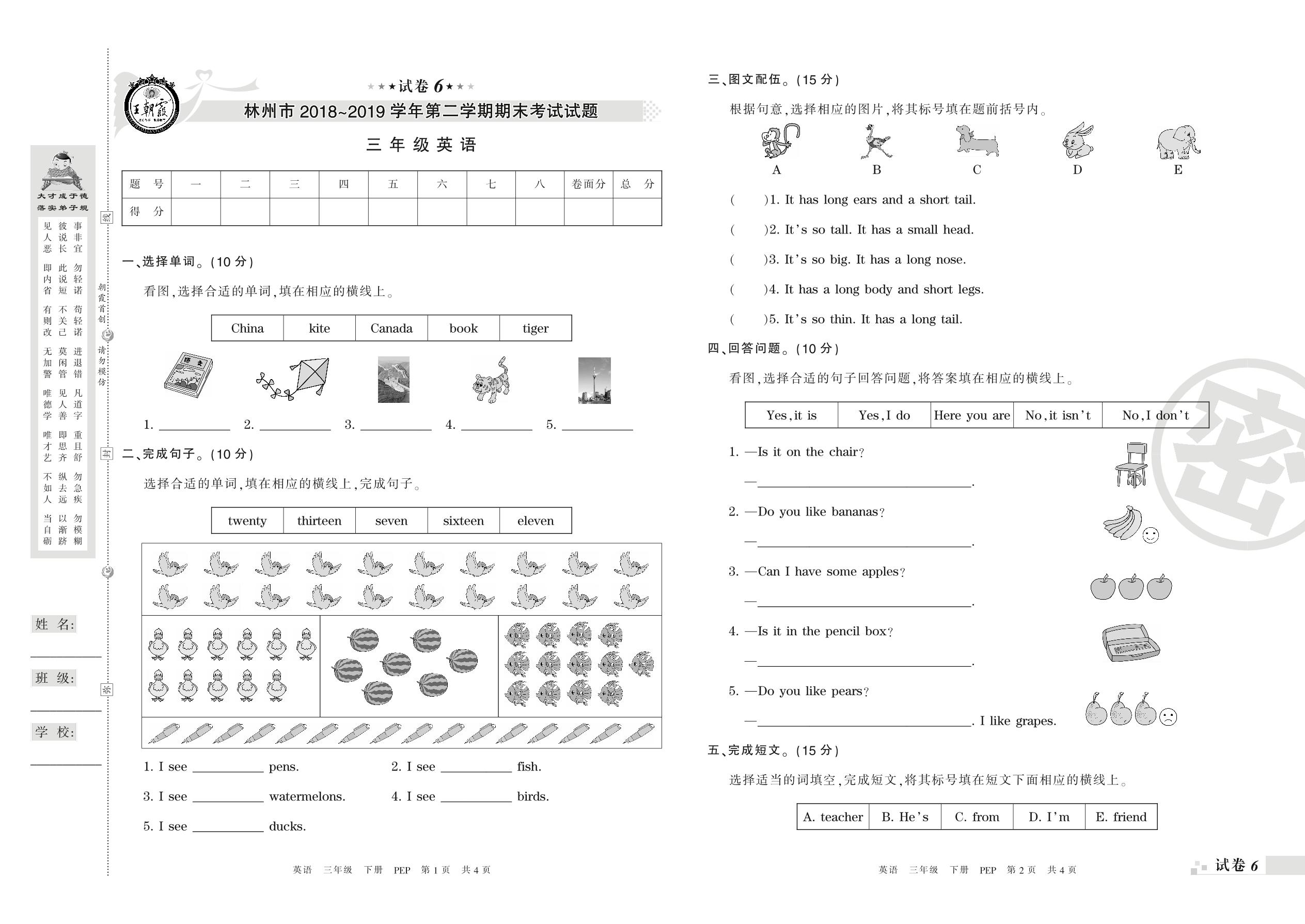 2018-2019学年第二学期林州市三年级英语试卷(PEP版)【6】