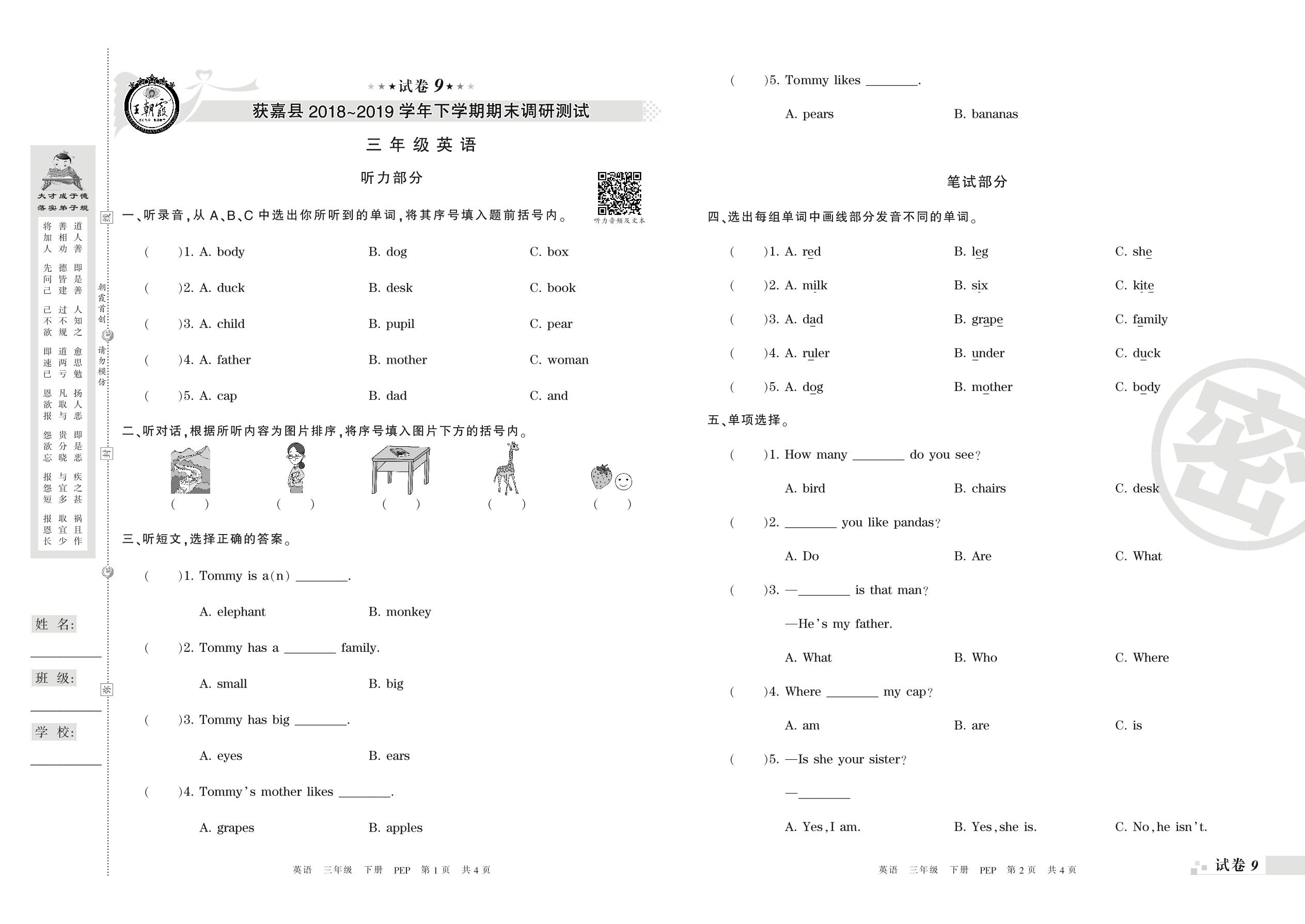 2018-2019学年第二学期新乡市获嘉县三年级英语试卷(PEP版)【9】