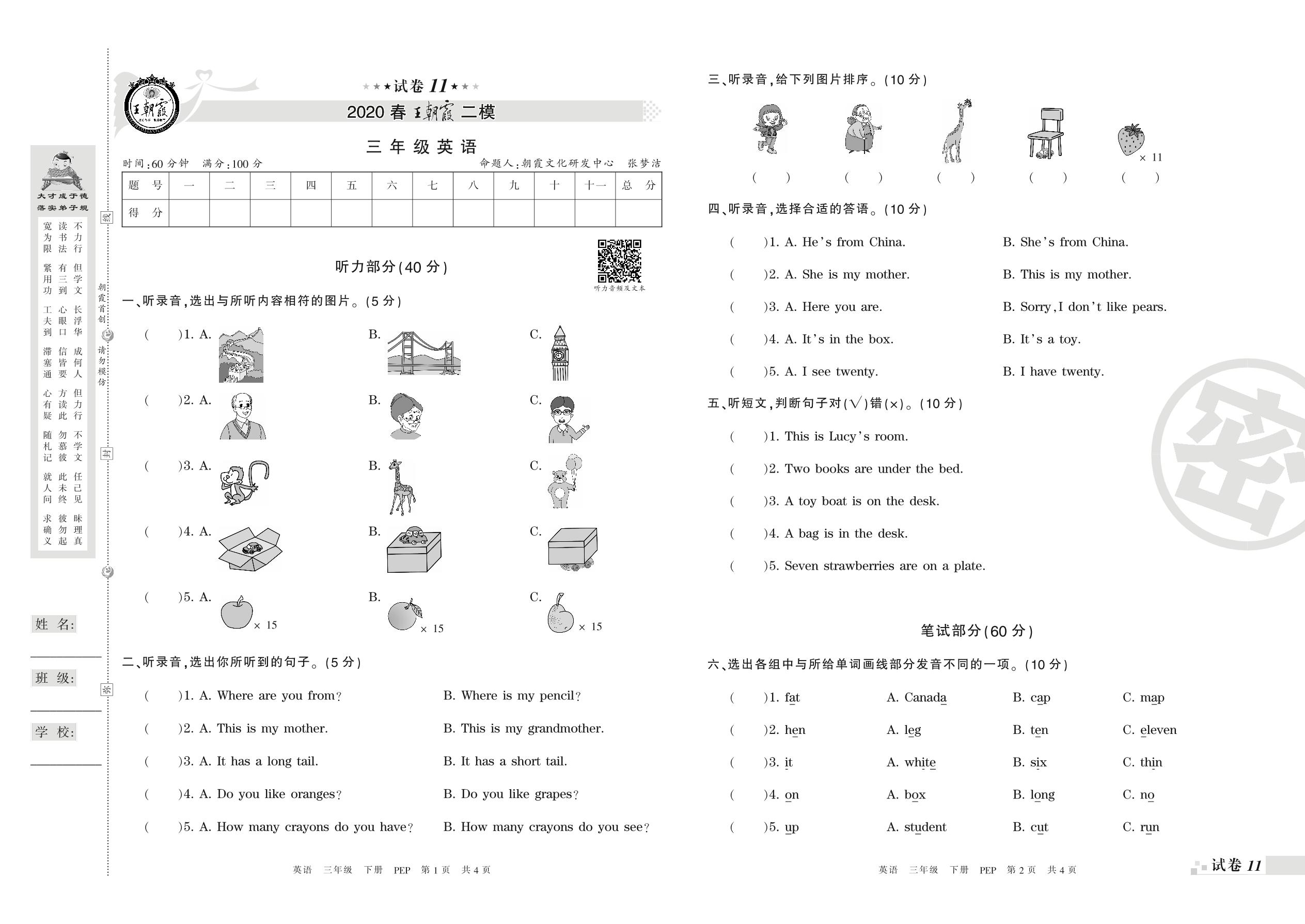 王朝霞期末模拟卷三年级下册英语(PEP版)_R210806190346【11】