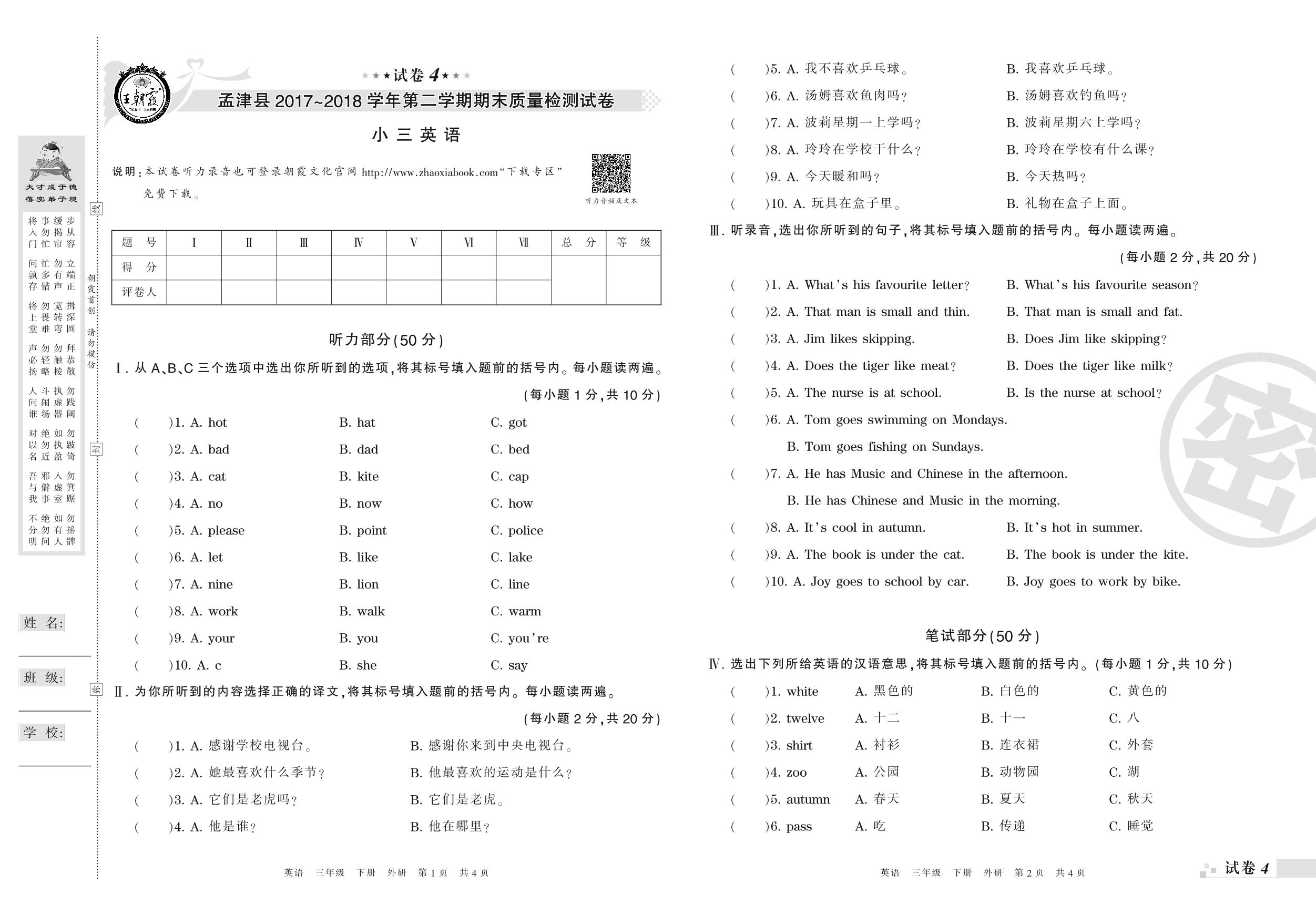 2017-2018学年第二学期洛阳市孟津县三年级英语试卷(外研版)【4】