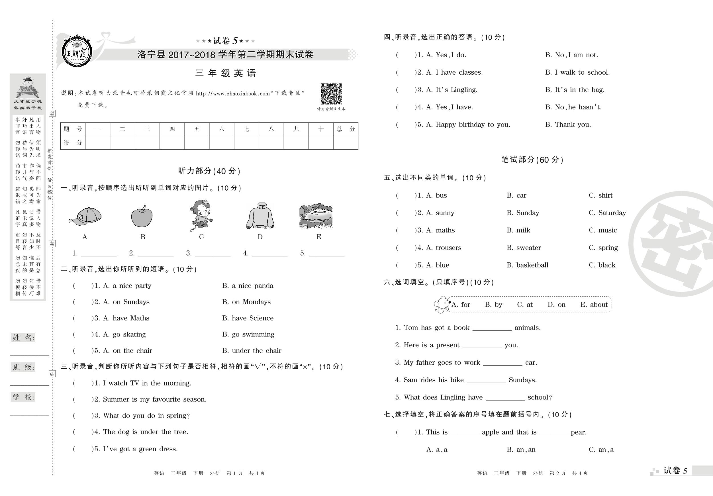 2017-2018学年第二学期洛阳市洛宁县三年级英语试卷(外研版)【5】