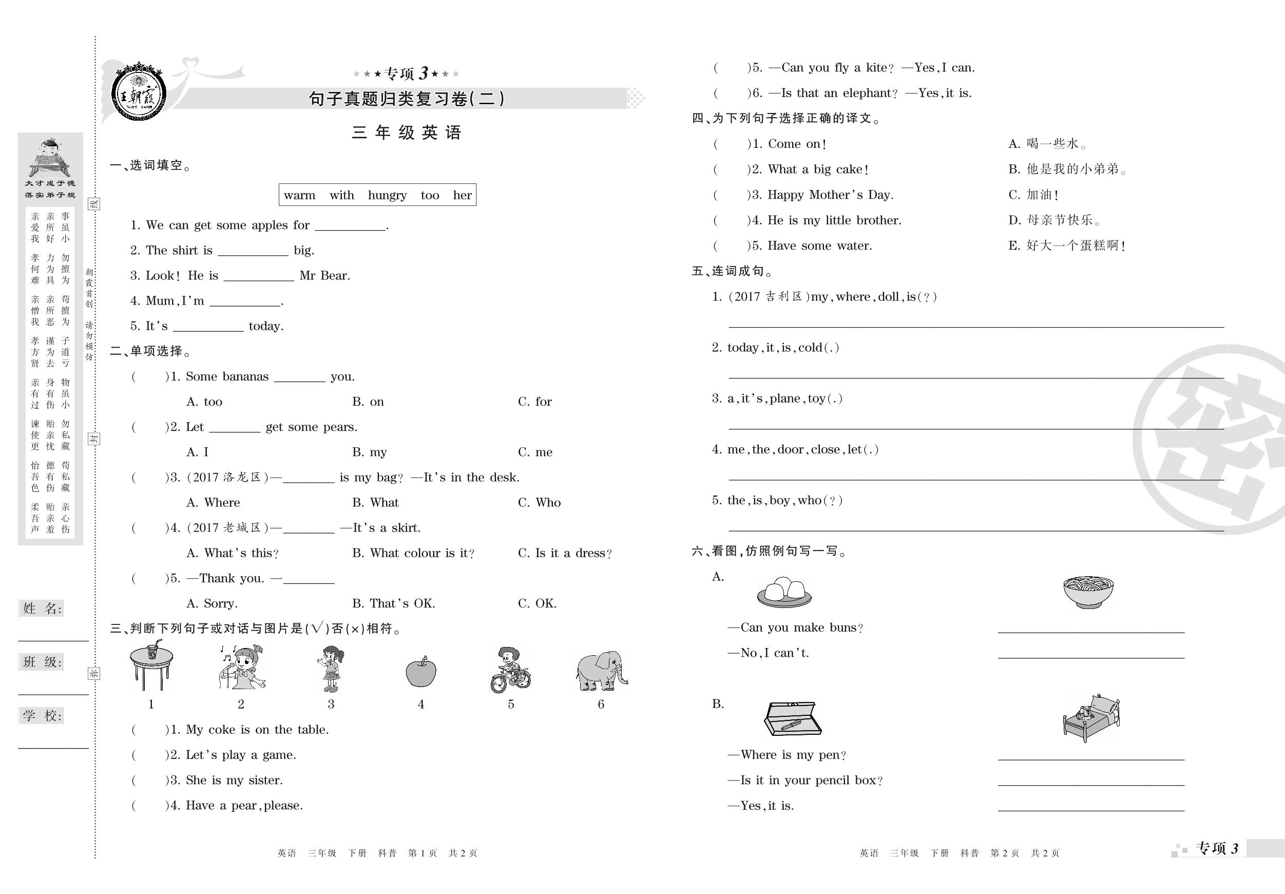 三年级英语科普版下册专项卷