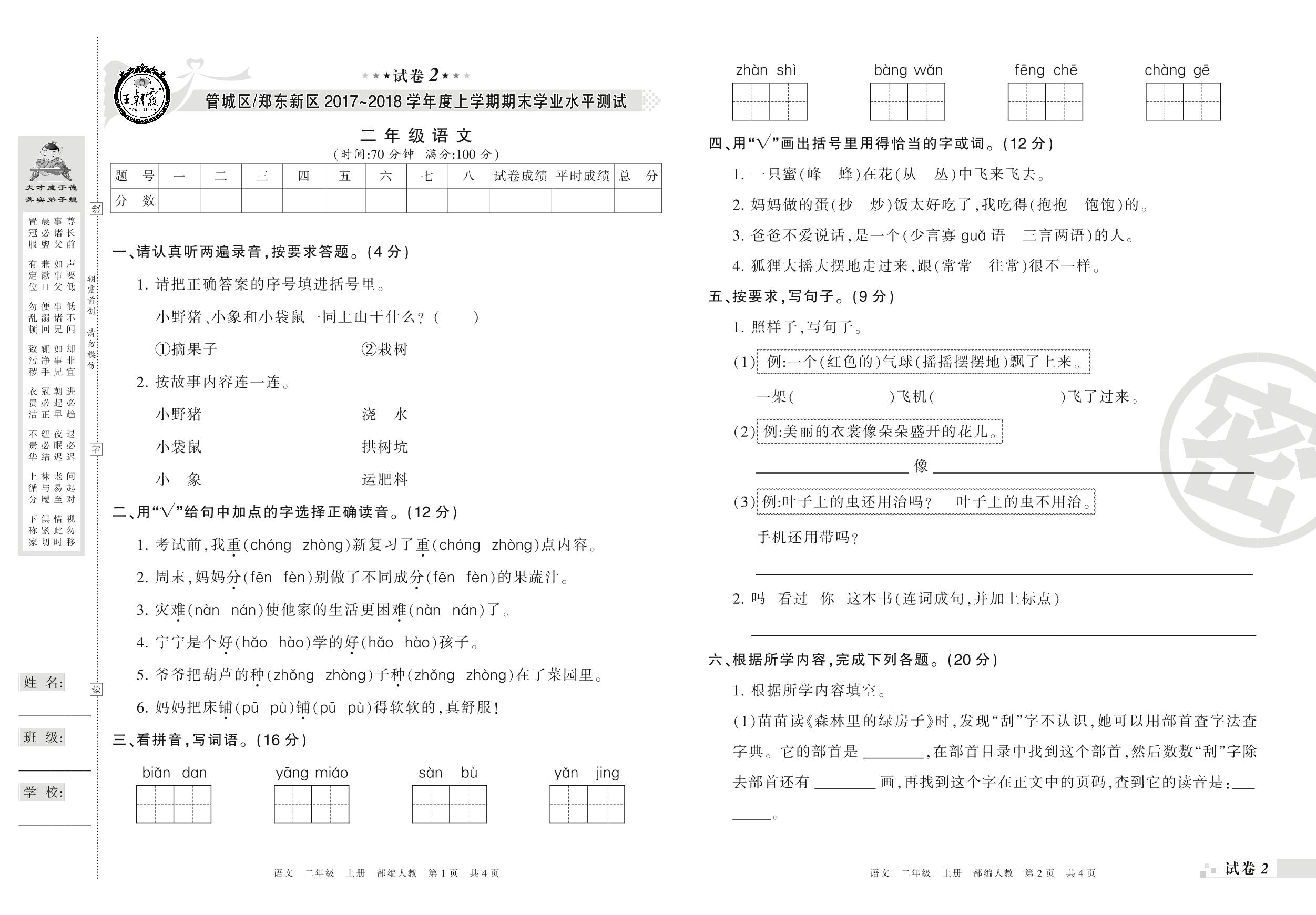 2017-2018学年第一学期郑州市管城区(郑东新区)二年级语文试卷(人教版)【2】