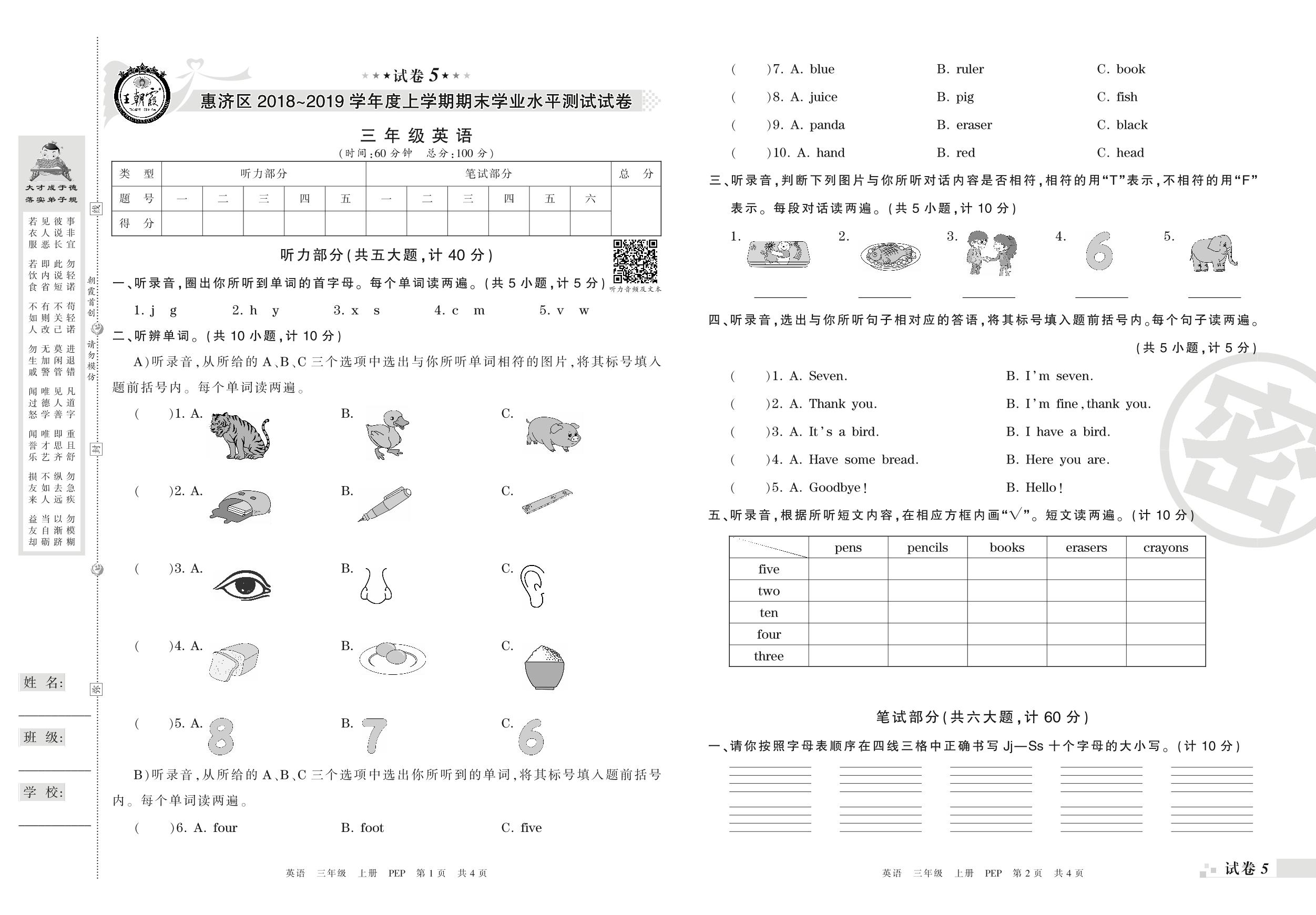 2018-2019学年第一学期郑州市惠济区三年级英语试卷(PEP版)【5】