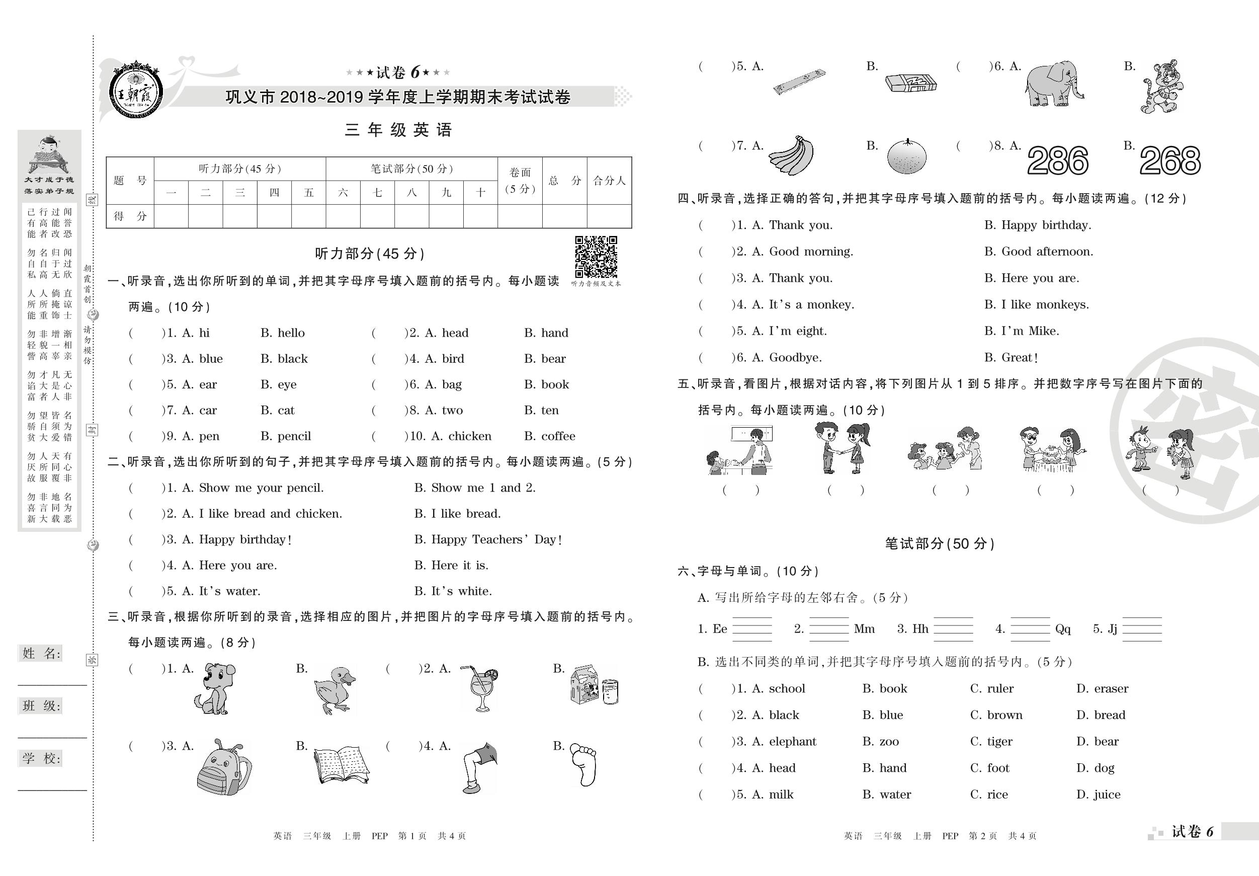 2018-2019学年第一学期巩义市三年级英语试卷(PEP版)【6】