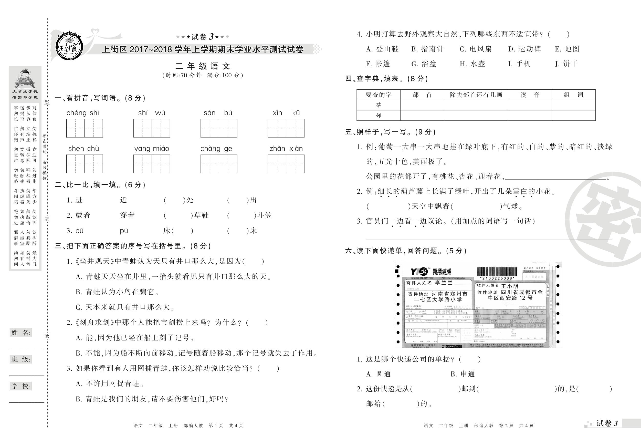 2017-2018学年第一学期郑州市上街区二年级语文试卷(人教版)【3】