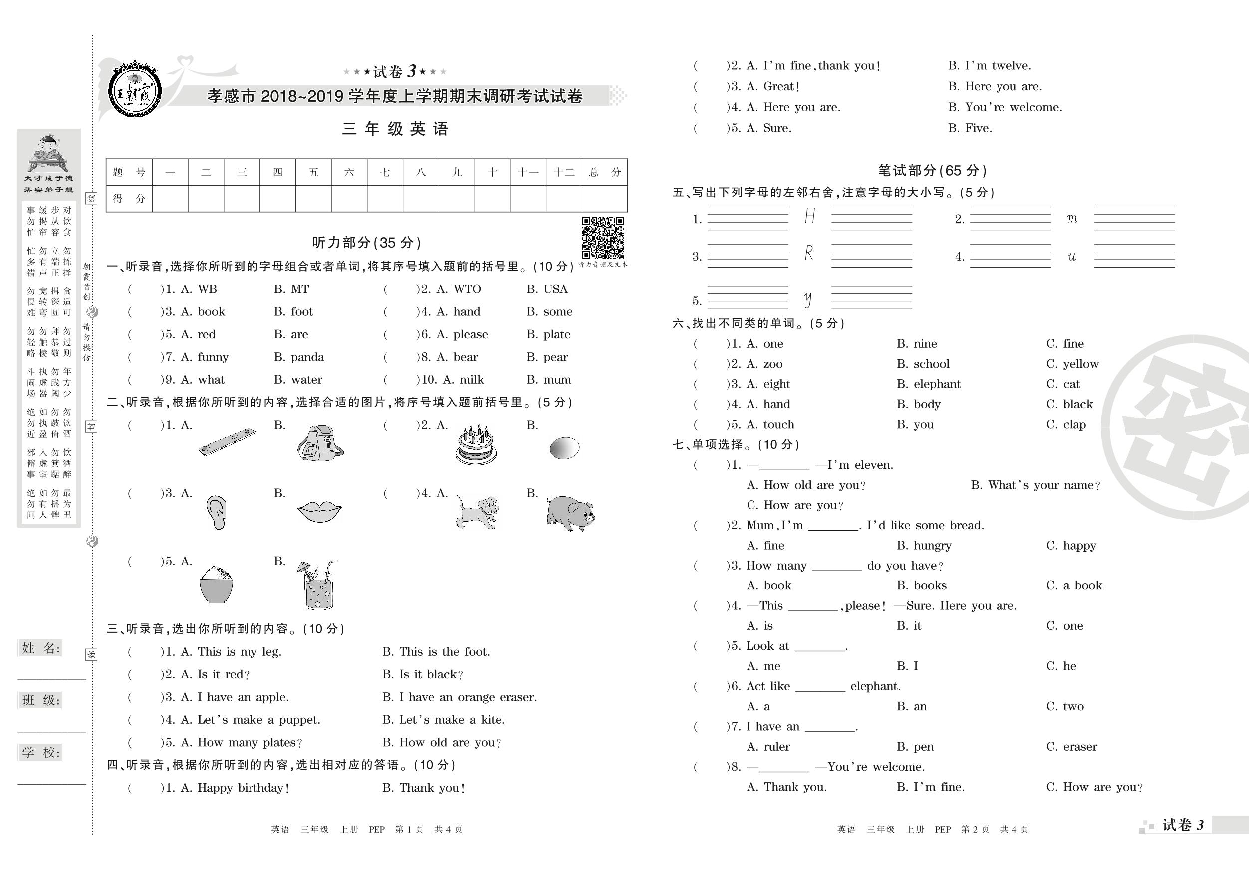 2018-2019学年第一学期孝感市三年级英语试卷(PEP版)【3】