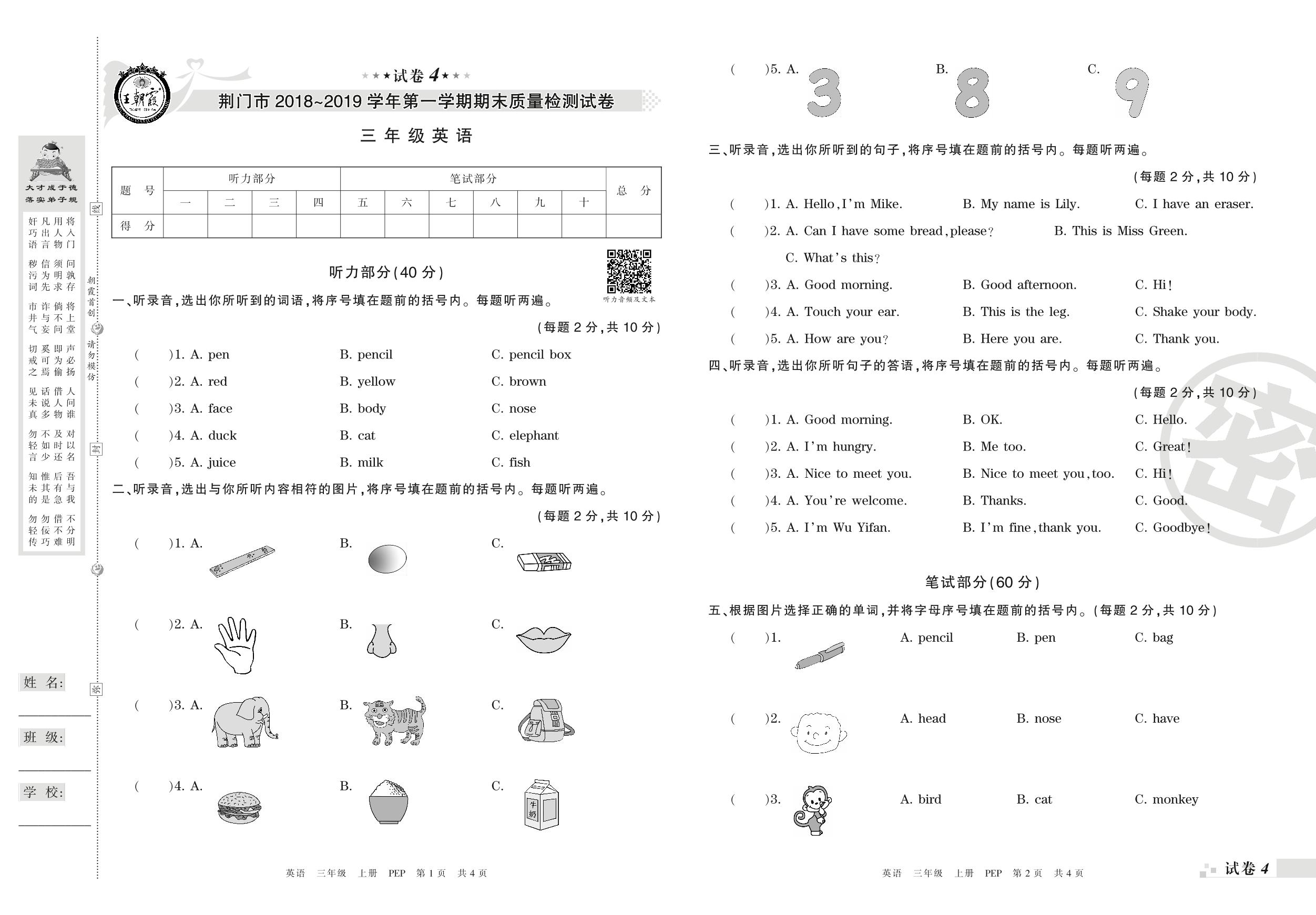 2018-2019学年第一学期荆门市三年级英语试卷(PEP版)【4】