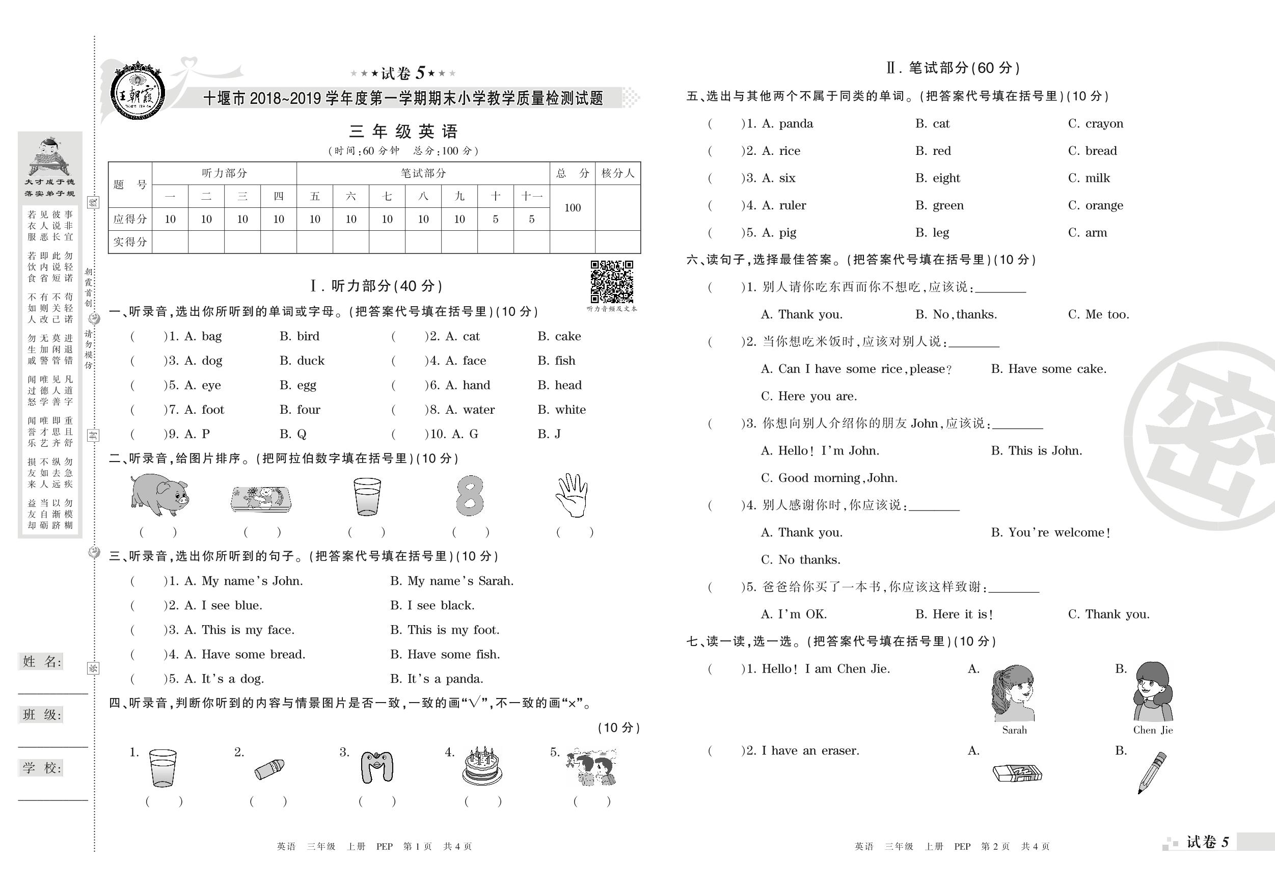 2018-2019学年第一学期十堰市三年级英语试卷(PEP版)【5】