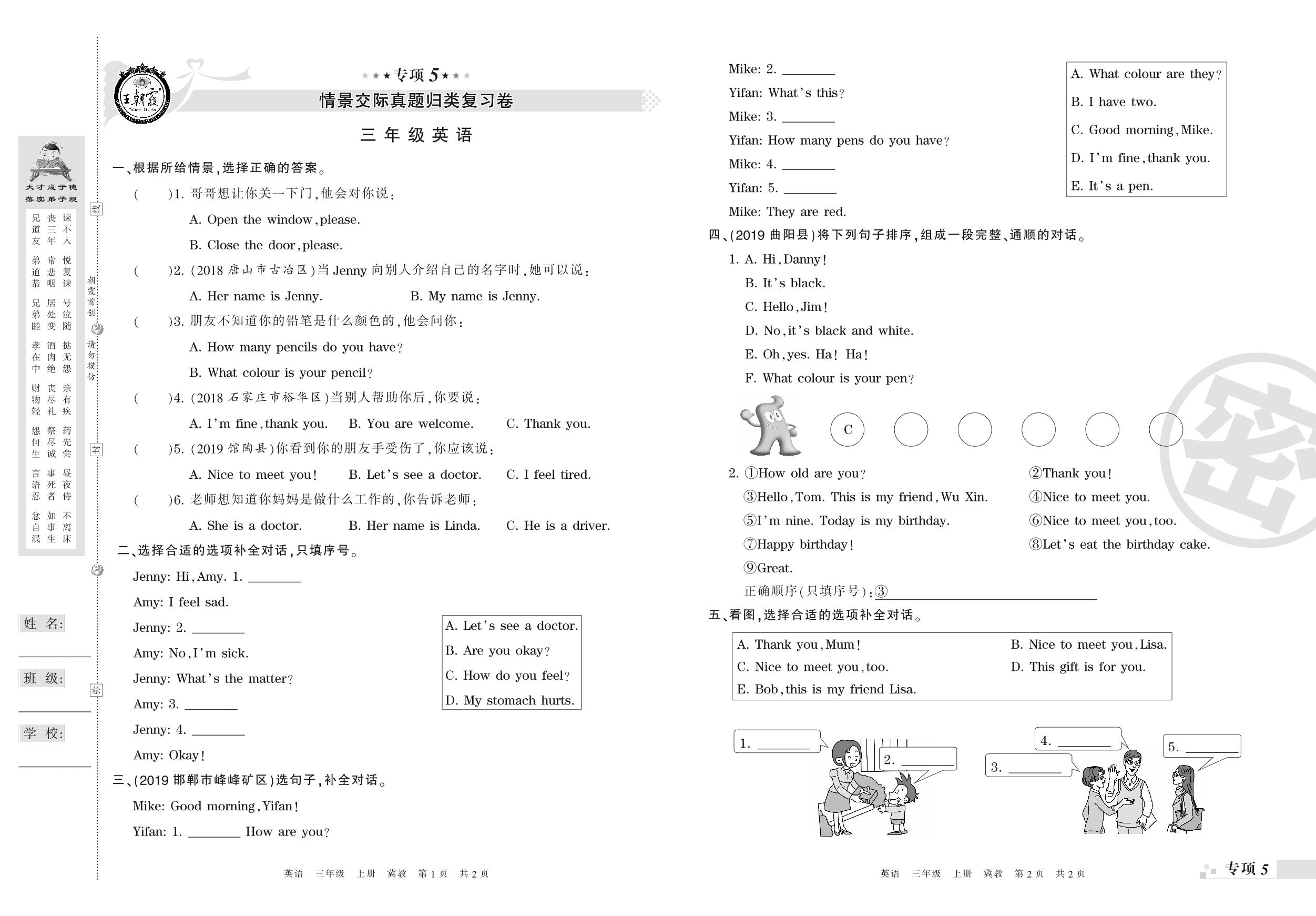 王朝霞期末专项卷——情景交际、阅读理解真题归类复习三年级上册英语(冀教版)_R210806190653【0】